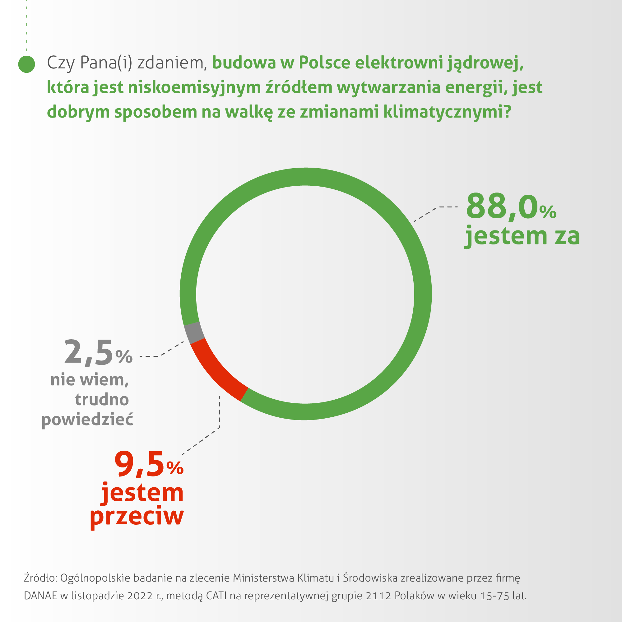 Blisko 90% ankietowanych uważa, że budowa elektrowni jądrowej jest dobrym sposobem na walkę ze zmianami klimatycznymi. Z kolei ponad 90% biorących udział w badaniu jest zdania, że budowa w Polsce elektrowni jądrowej przyczyni się do zwiększenia bezpieczeństwa energetycznego kraju. Jednocześnie ponad 90% badanych potwierdziło, że słyszało o planach budowy pierwszej elektrowni jądrowej w Polsce.