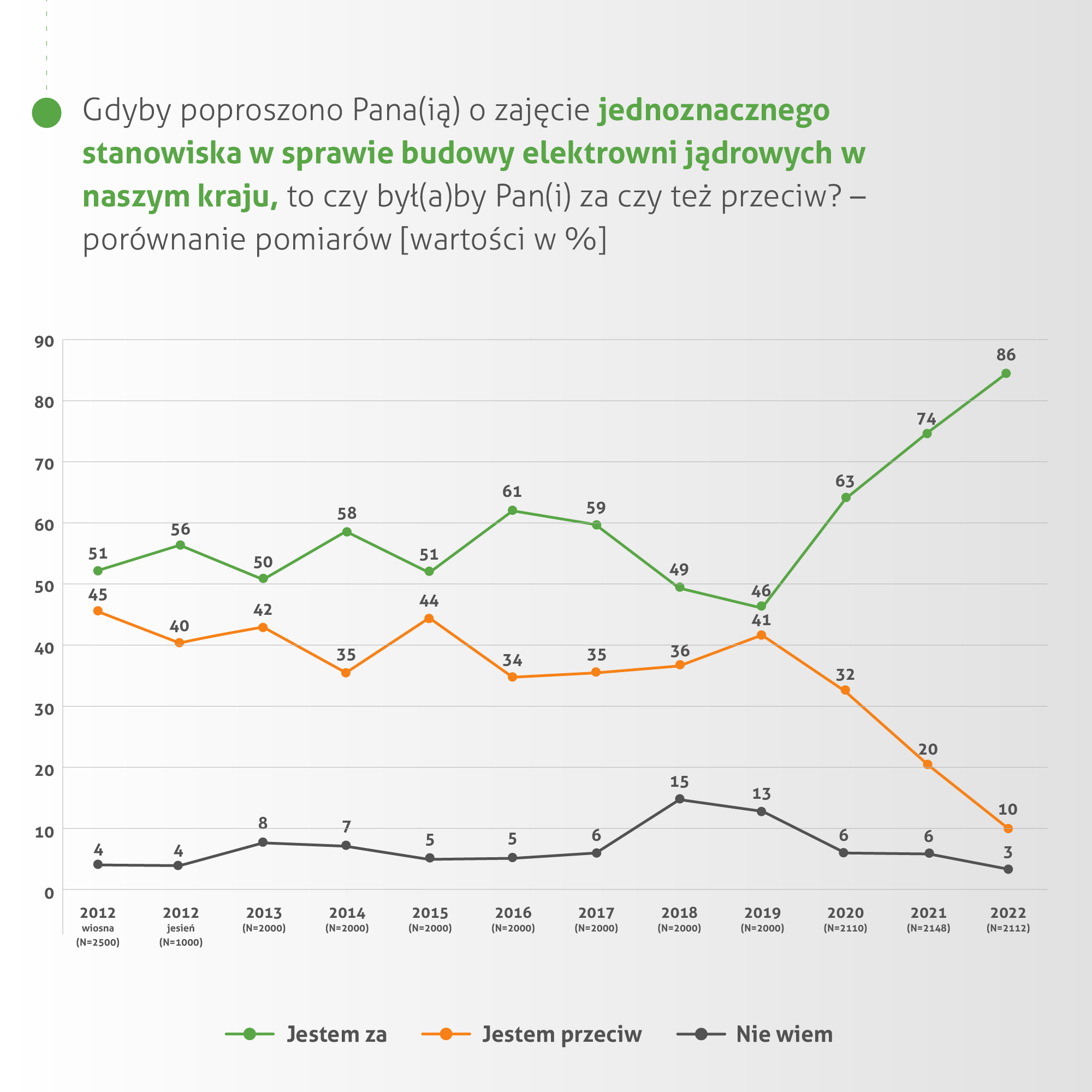 Badanie z listopada 2022 r. wskazuje, że ponad 86% ankietowanych wyraża poparcie dla elektrowni jądrowych w naszym kraju, a 10% jest przeciwnego zdania. W porównaniu do roku 2021 odnotowano wzrost zwolenników tego typu inwestycji aż o 12%.