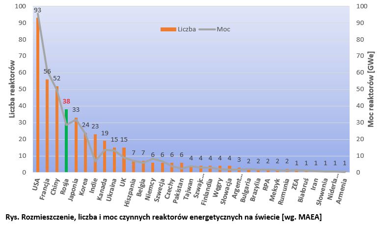 Rys. Rozmieszczenie, liczba i moc czynnych reaktorów energetycznych na świecie [wg. MAEA] - w załączeniu