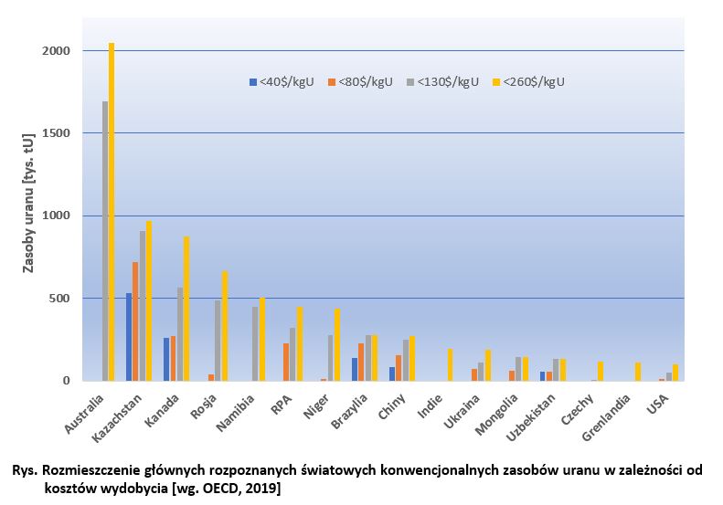 Infografika "Rozmieszczenie głównych rozpoznanych światowych konwencjonalnych zasobów uranu w zależności od kosztów wydobycia [wg. OECD, 2019]" - w załączeniu