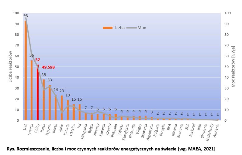 Obecnie Chiny eksploatując 52 energetyczne reaktory jądrowe o sumarycznej mocy 49,598 GWe dysponują trzecią co do wielkości flotą reaktorów energetycznych na świecie (po USA – 93 i Francji – 58); 14 reaktorów o mocy 13,295 GWe znajduje się w budowie. W roku 2020 energetyka jądrowa dostarczyła 366,300 TWh energii elektrycznej, a jej udział w krajowej produkcji elektryczności wyniósł 4,9%.