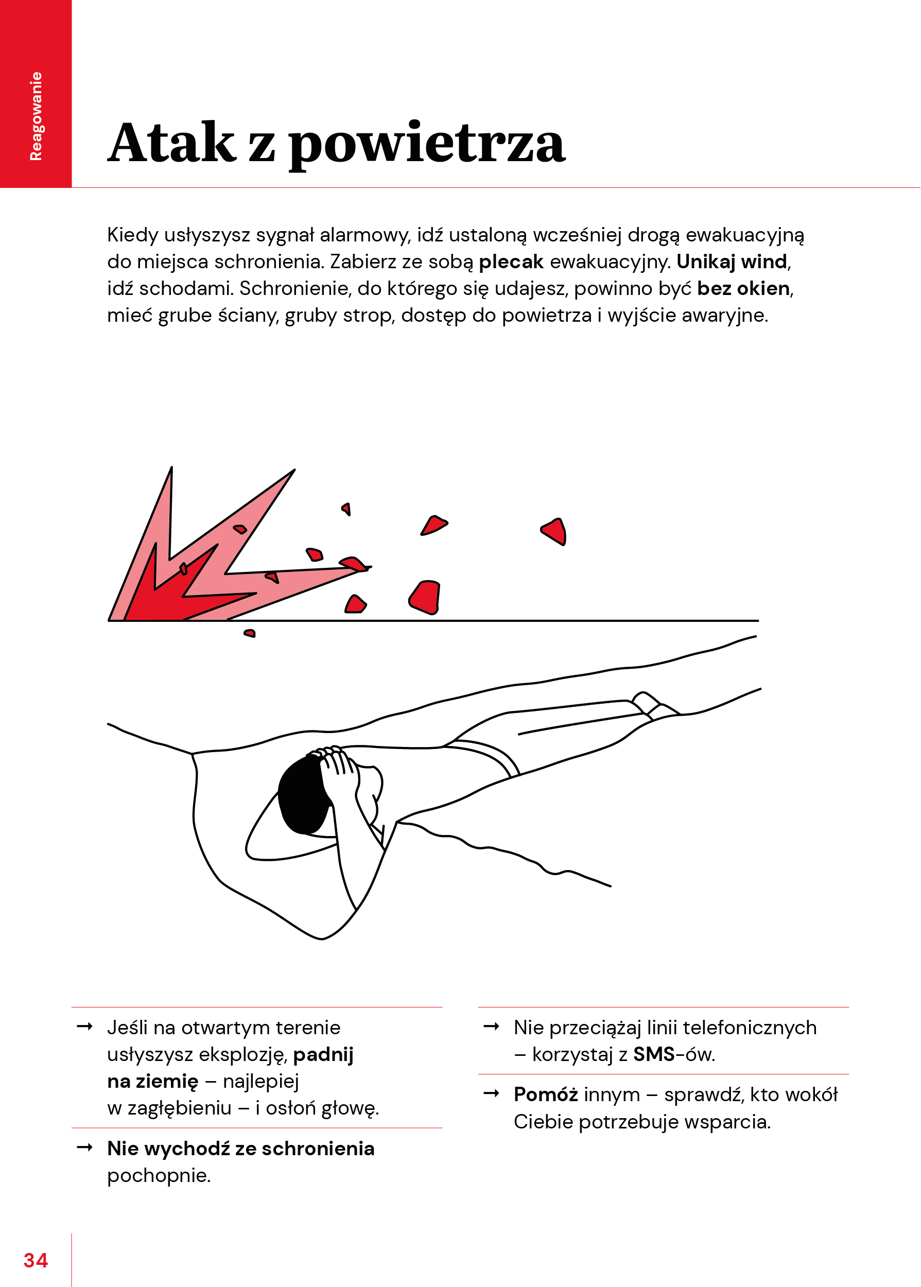 - Jeśli na otwartym terenie usłyszysz eksplozję, padnij na ziemię – najlepiej w zagłębieniu – i osłoń głowę.