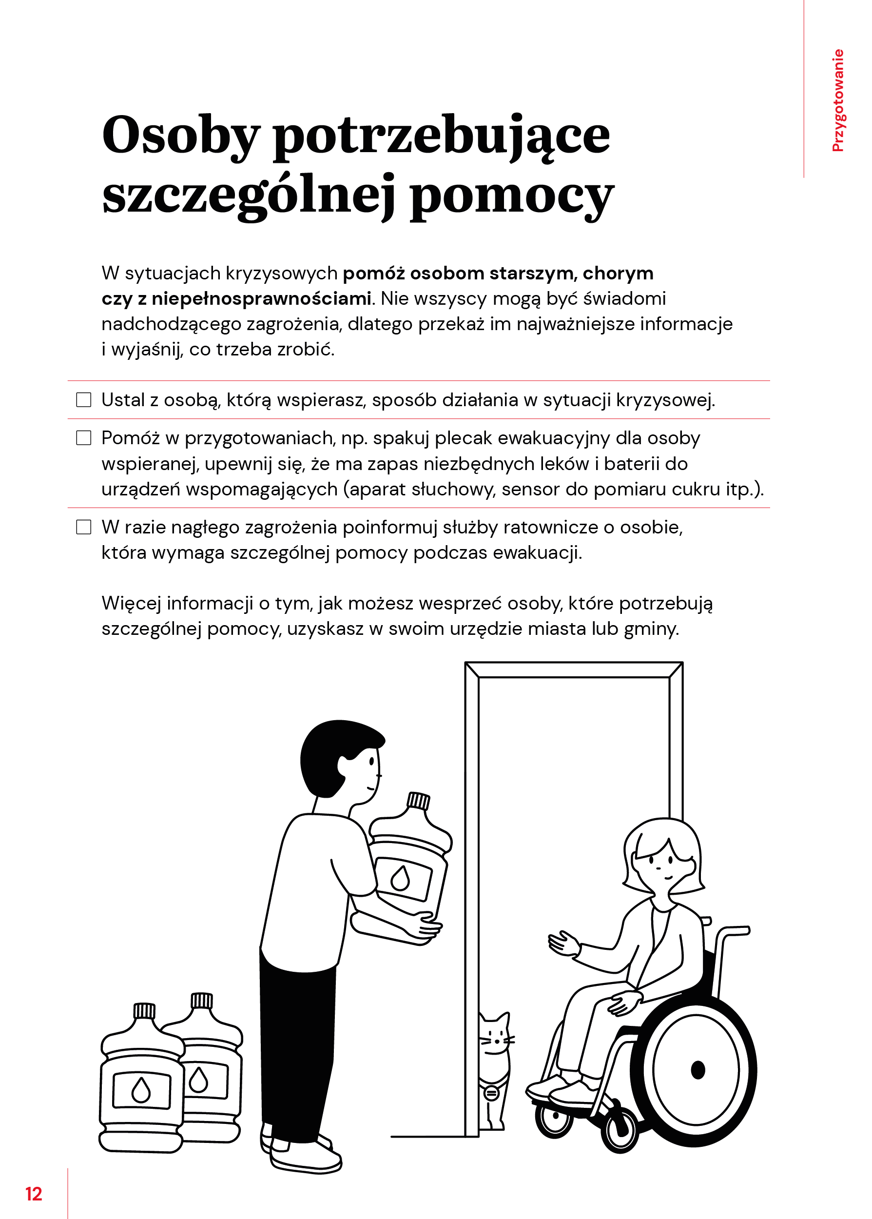 - Pomóż w przygotowaniach, np. spakuj plecak ewakuacyjny dla osoby wspieranej, upewnij się, że ma zapas niezbędnych leków i baterii do urządzeń wspomagających (aparat słuchowy, sensor do pomiaru cukru itp.).