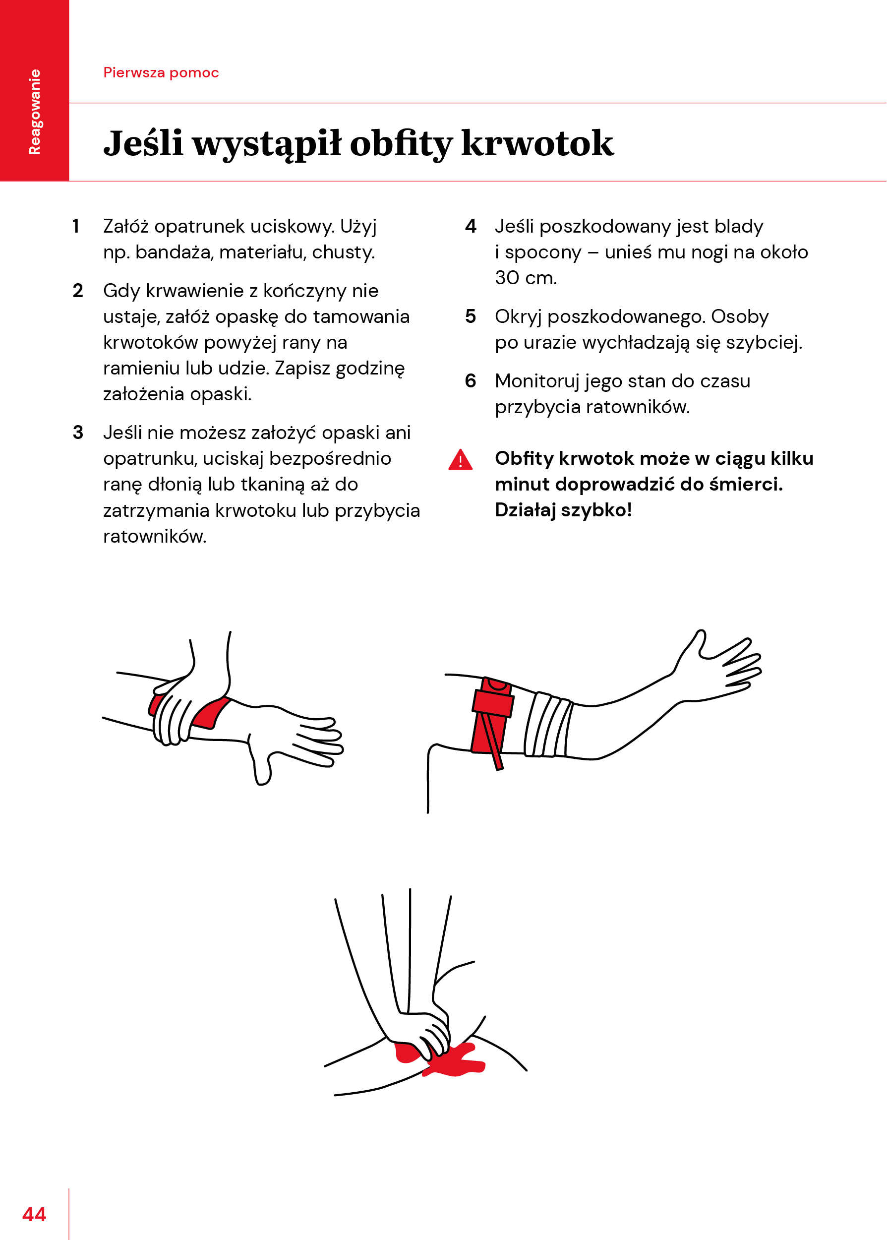 - Jeśli nie możesz założyć opaski ani opatrunku, uciskaj bezpośrednio ranę dłonią lub tkaniną aż do zatrzymania krwotoku lub przybycia ratowników.