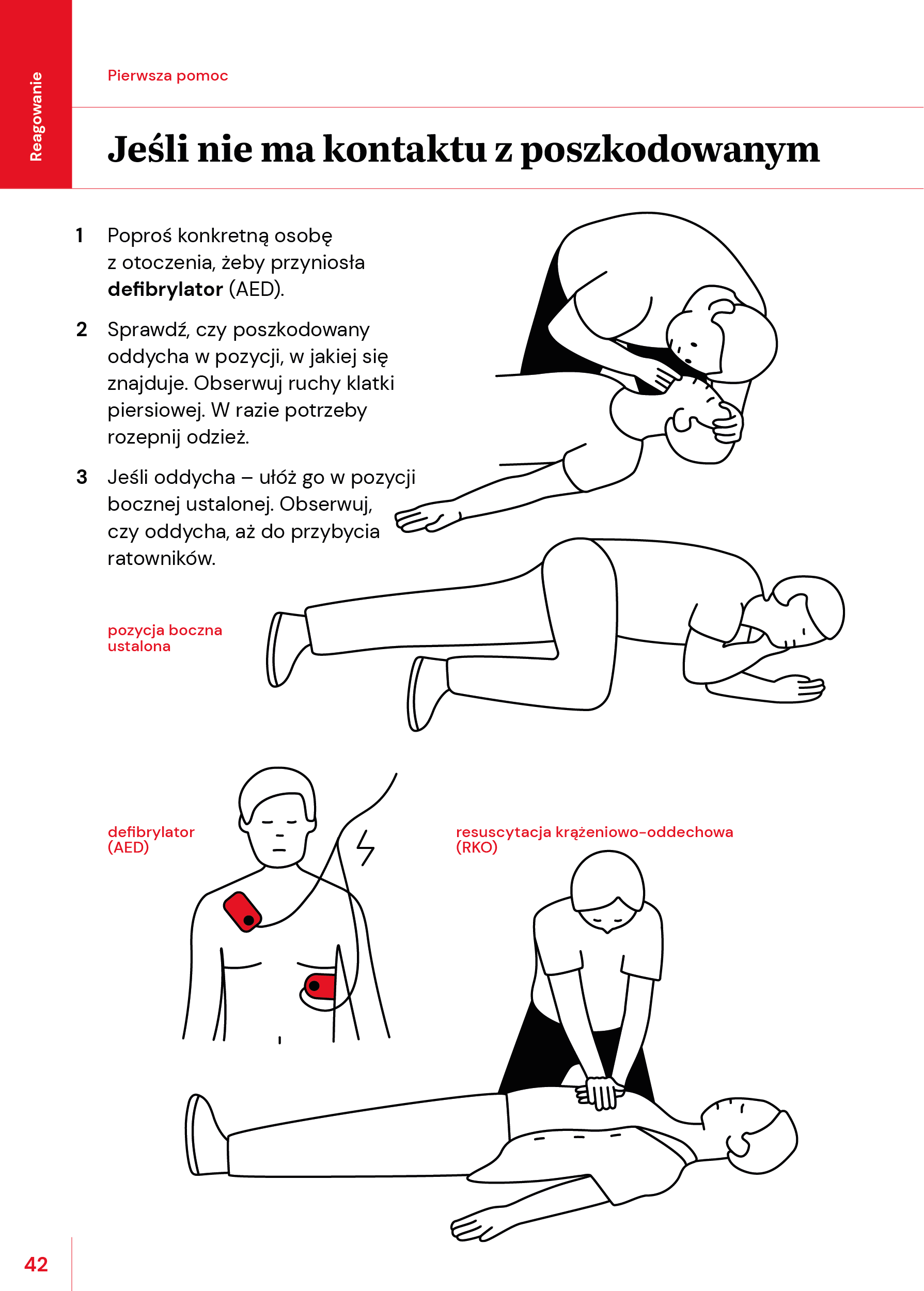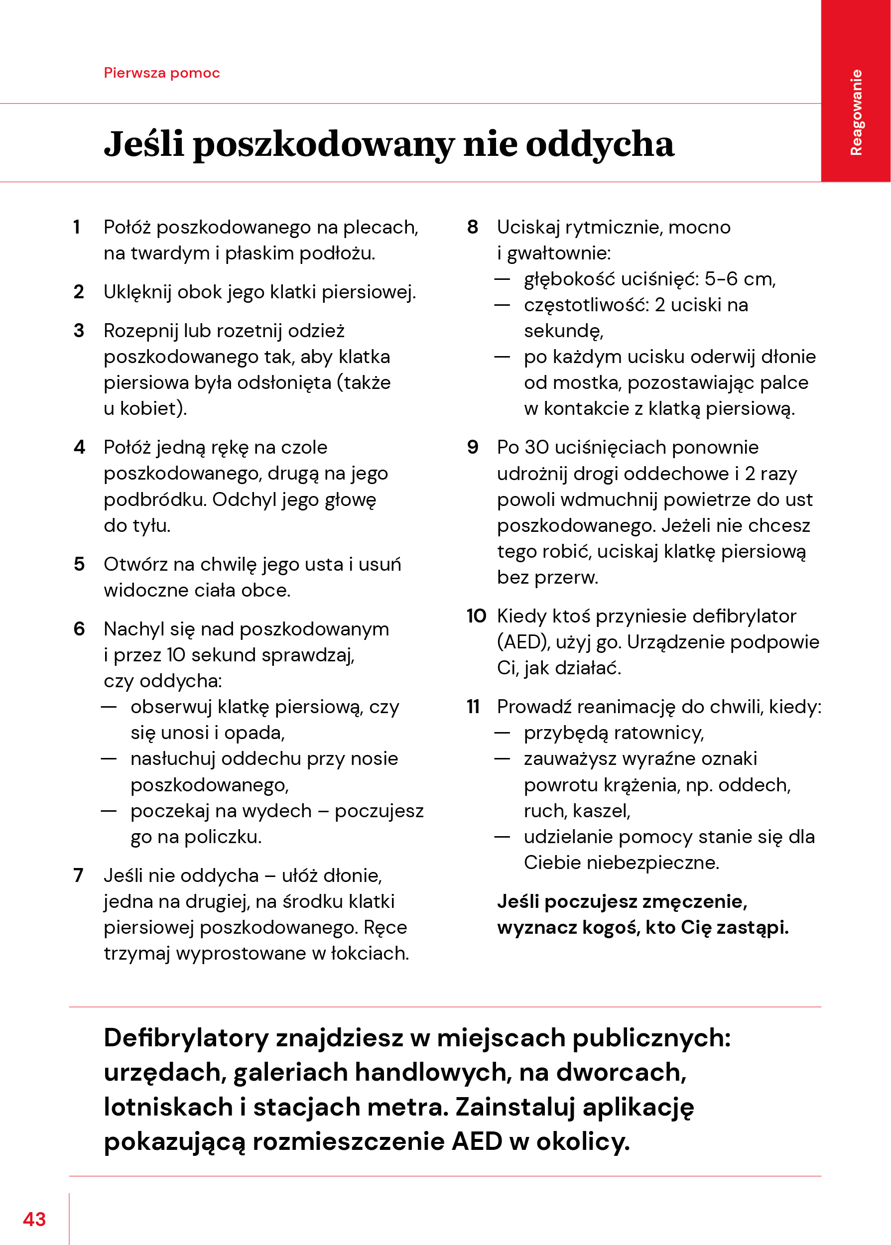 - Kiedy ktoś przyniesie defibrylator (AED), użyj go. Urządzenie podpowie Ci, jak działać.