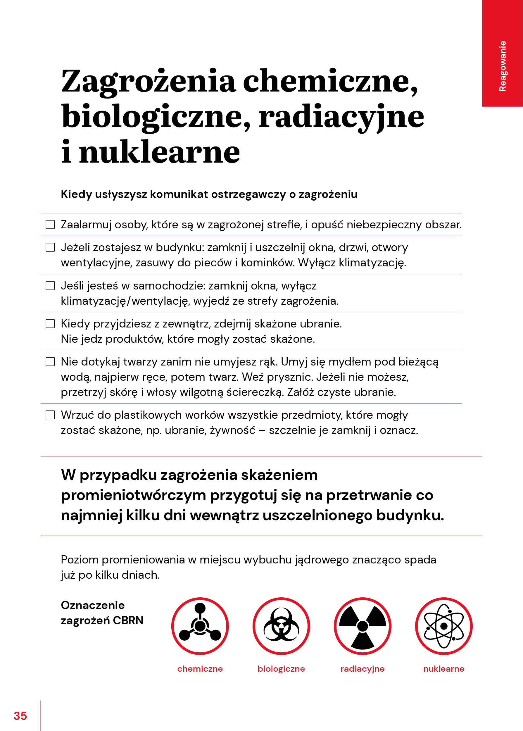 W przypadku zagrożenia skażeniem promieniotwórczym przygotuj się na przetrwanie co najmniej kilku dni wewnątrz uszczelnionego budynku.