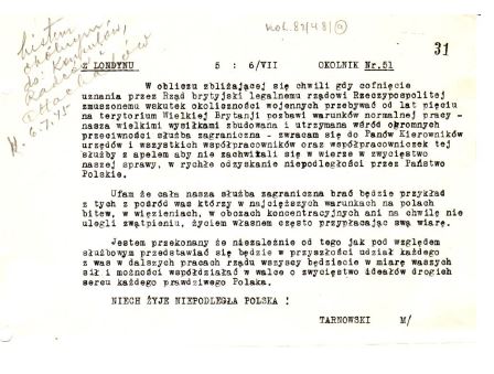 Em 6 de julho de 1945, no dia seguinte à retirada do reconhecimento do Governo polaco pelos países mais importantes da Coalizão, o Ministro Adam Tarnowski dirigiu uma nota aos chefes de todos os cargos polacos, na qual declarou: "Estou convencido de que, independentemente dos futuros termos de serviço de cada um de vós, todos vós fareis tudo, dentro de suas capacidades e forças, pela vitória dos ideais que estão no coração de cada verdadeiro polaco. Viva Polónia independente!".