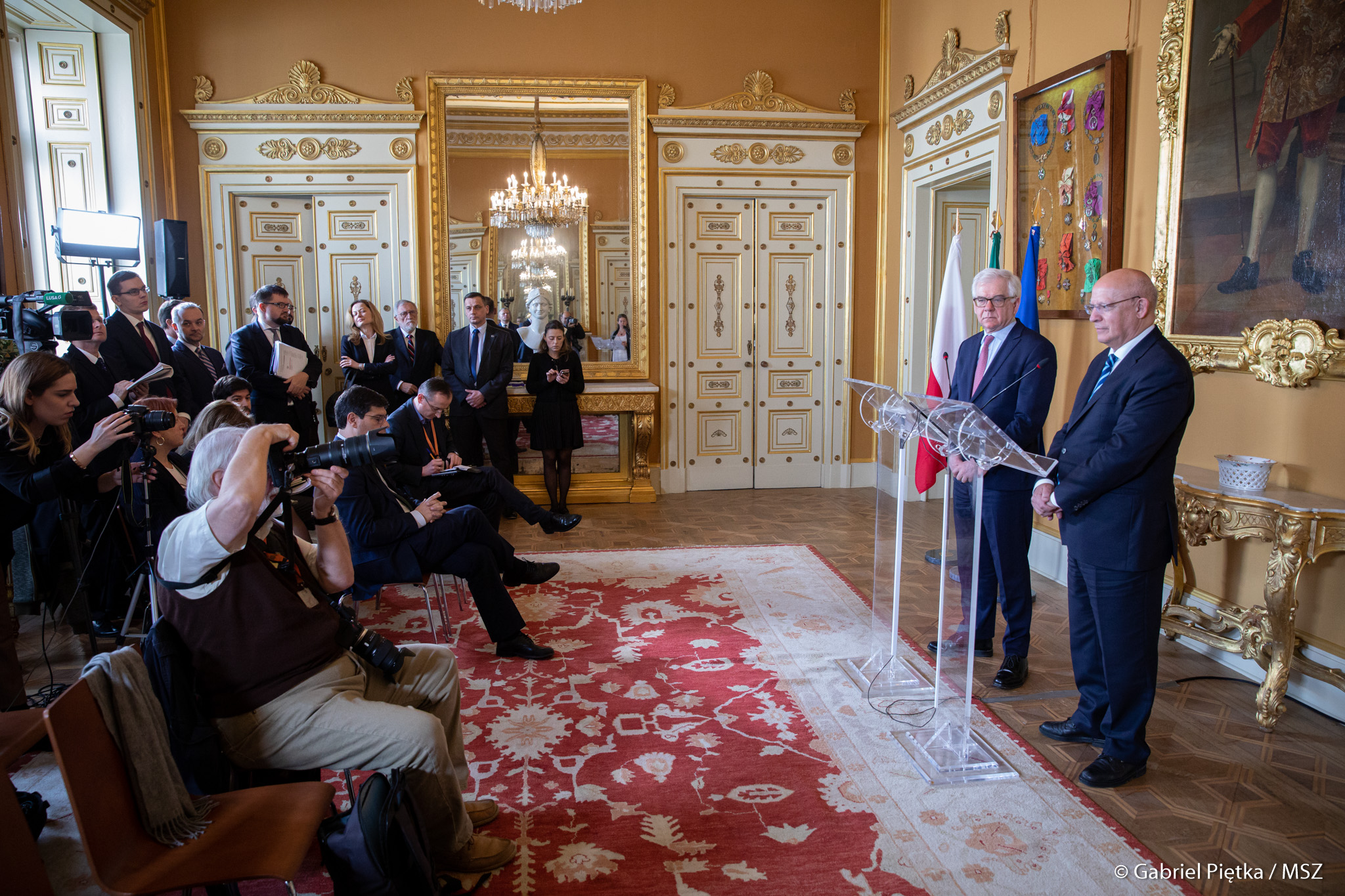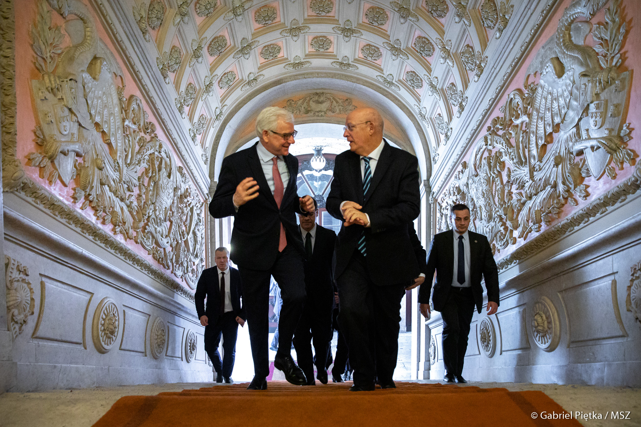O ministro Czaputowicz agradeceu ao ministro Santos Silva pelo envolvimento de Portugal no processo de Varsóvia - uma iniciativa internacional para a paz no Médio Oriente, inaugurada em fevereiro de 2019 durante uma conferência em Varsóvia.
