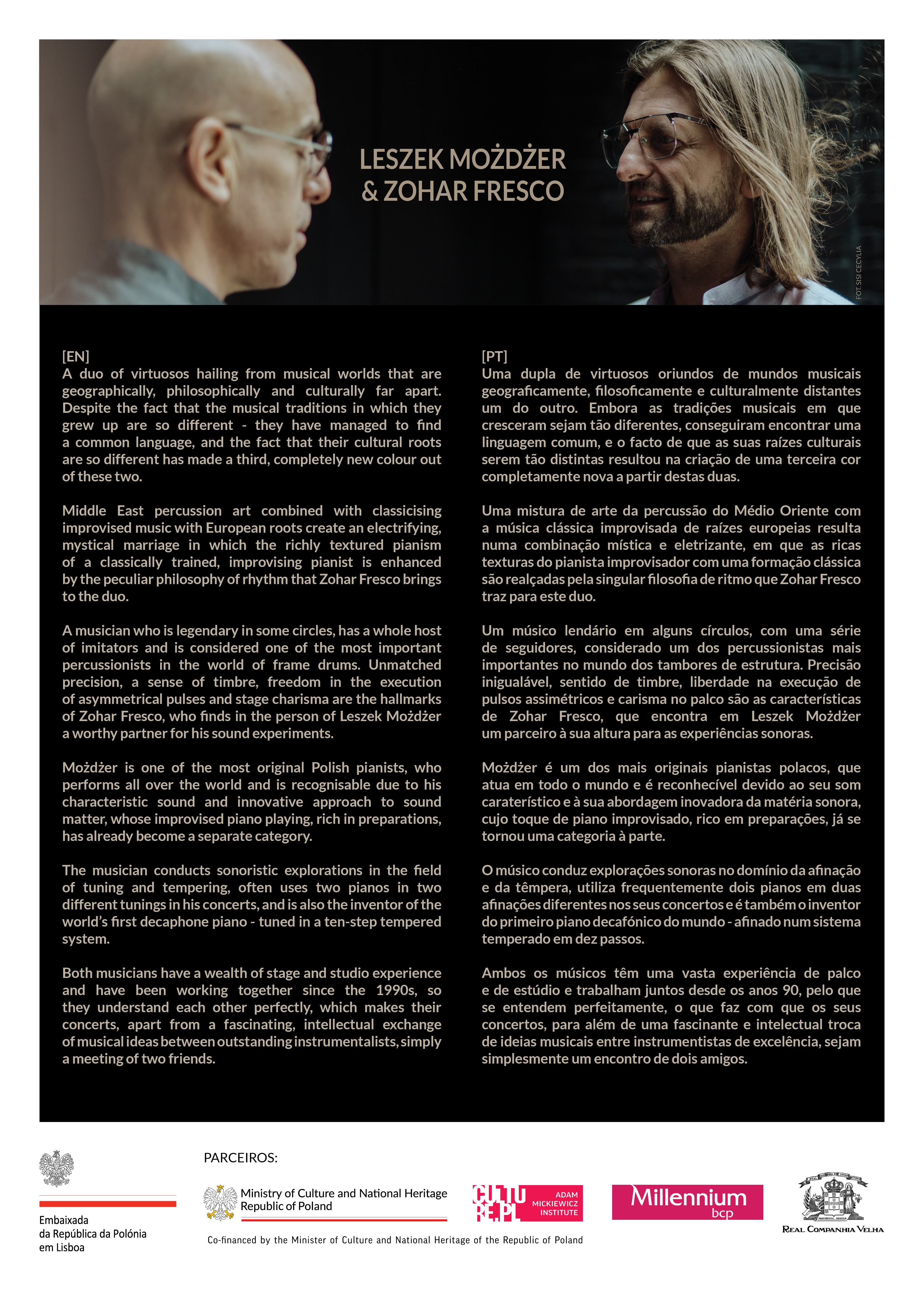 5 listopada, na zaproszenie Ambasady RP, Leszek Możdżer wystąpi w Lizbonie z Zoharem Fresco, legendarnym muzykiem posiadającym szereg naśladowców, uważanym za jednego z najważniejszych perkusjonistów w świecie bębnów ramowych.