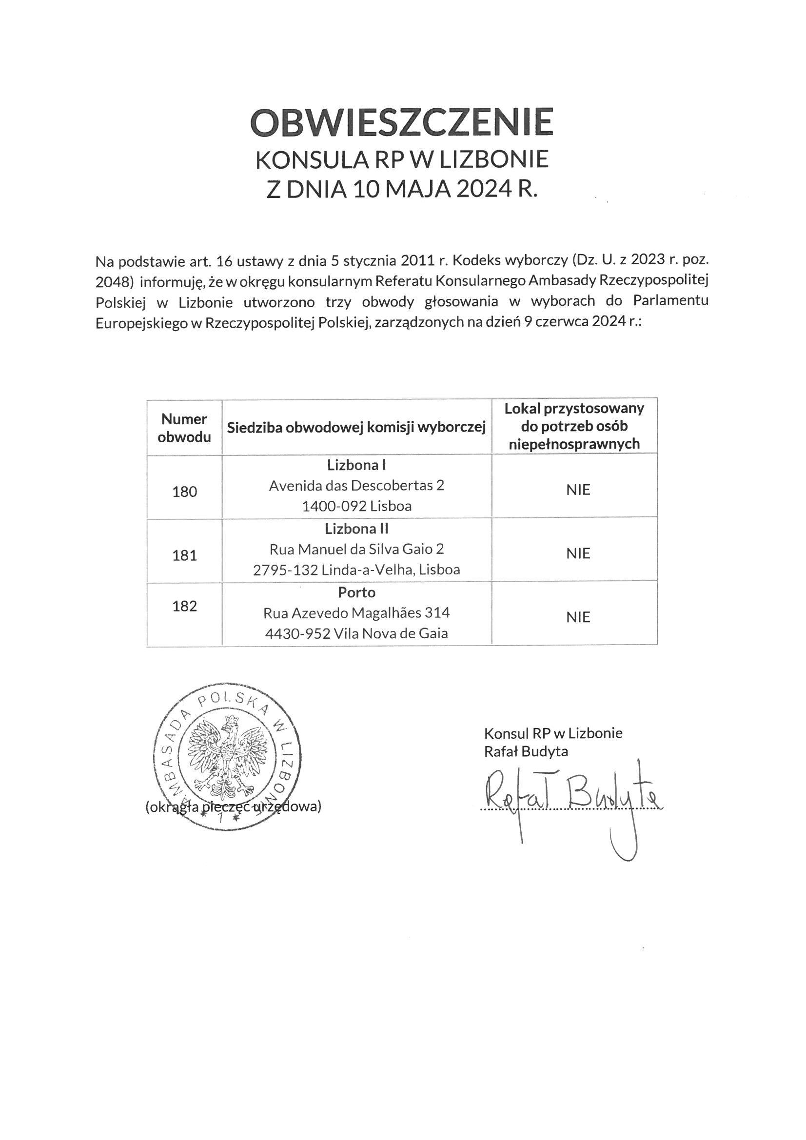 Obwieszczenie Konsula RP w Lizbonie w sprawie utworzenia obwodów głosowania w wyborach do Parlamentu Europejskiego