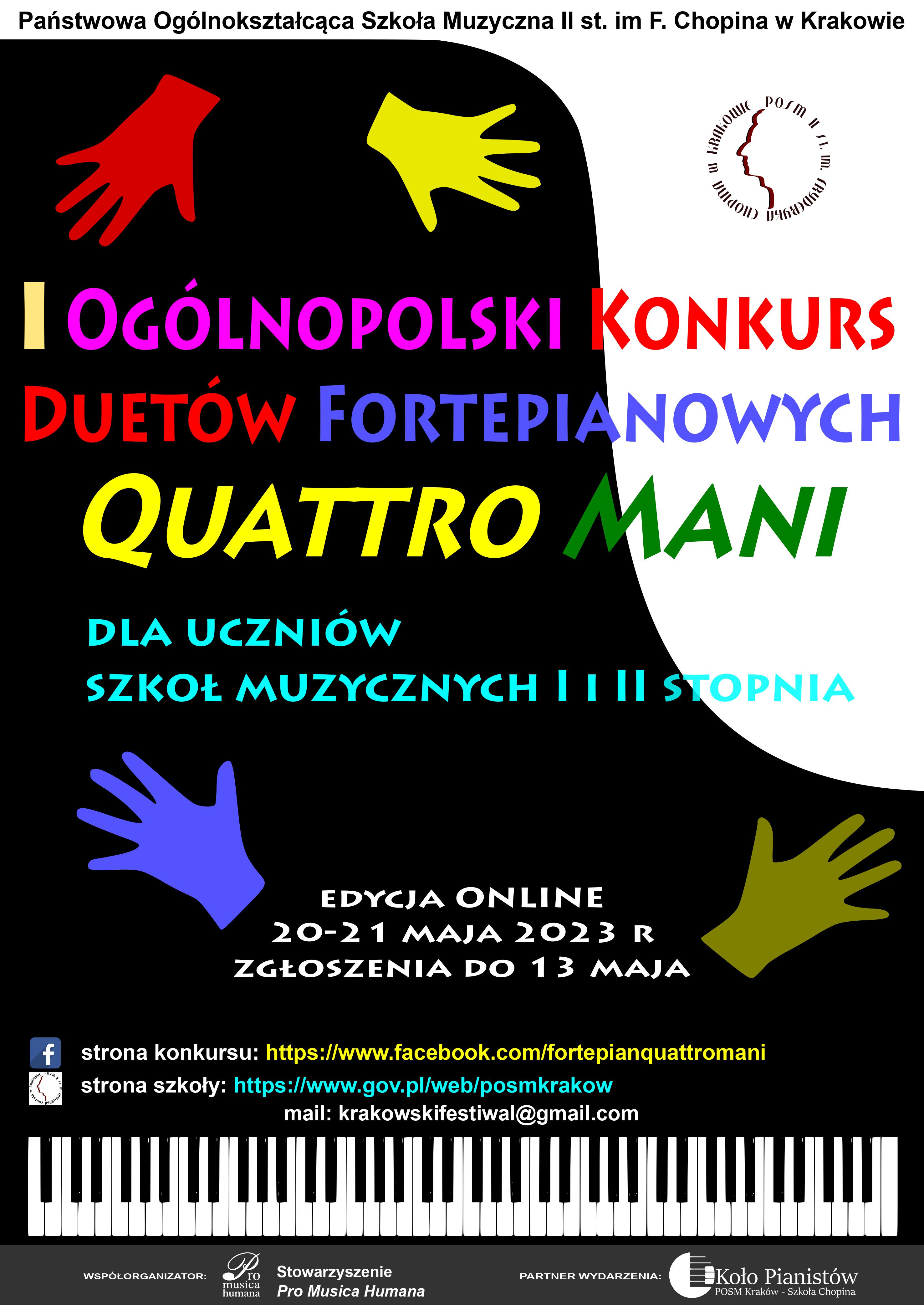 - I Ogólnopolski Konkurs Duetów Fortepianowych Quattro Mani organizowany jest przez Państwową Ogólnokształcącą Szkołę Muzyczną II st. im. F. Chopina w Krakowie. Współorganizatorem Konkursu jest Stowarzyszenie Pro Musica Humana. Partnerem wydarzenia jest Koło Pianistów POSM Kraków - Szkoła Chopina.