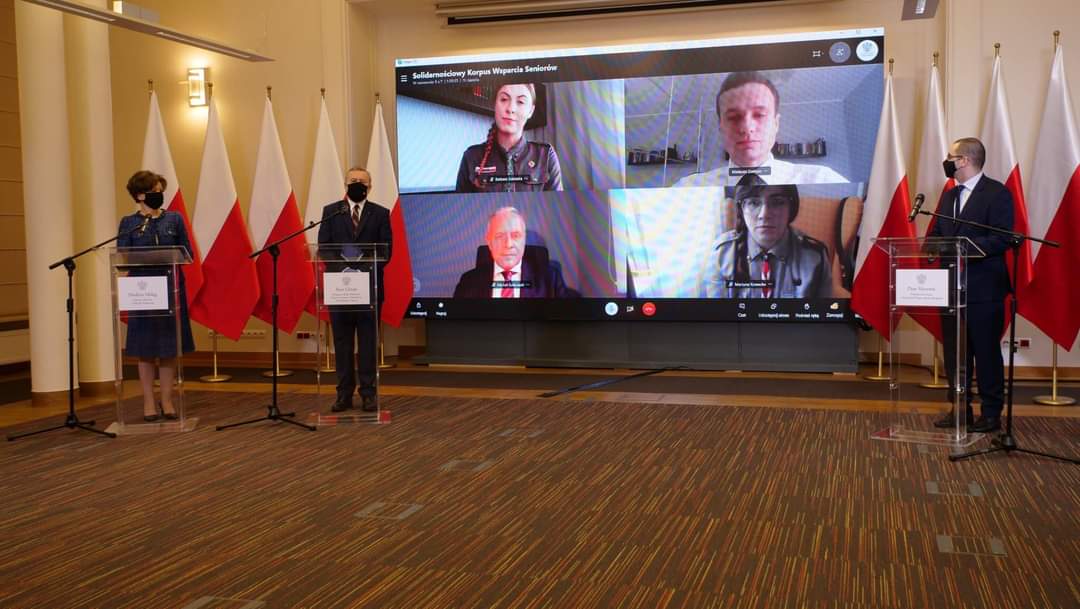 Na briefingu prasowym w Ministerstwie Rodziny i Polityki Społecznej, w którym wzięli udział Wiceprezes Rady Ministrów, Przewodniczący Komitetu ds. Pożytku Publicznego prof. Piotr Gliński, Minister Rodziny i Polityki Społecznej Marlena Maląg oraz Pełnomocnik Rządu ds. Polityki Młodzieżowej Piotr Mazurek, przedstawiono zakres wsparcia w ramach Solidarnościowego Korpusu Wsparcia Seniorów. W spotkaniu wzięli udział także Prezes Warszawskich Lekarzy Rodzinnych dr Michał Sutkowski, Harcmistrzyni ZHP Martyna Kowalska, Harcmistrzyni ZHR Barbara Sobieska oraz Mateusz Sorbjan z Młodzieżowej Rady Miasta Łodzi.