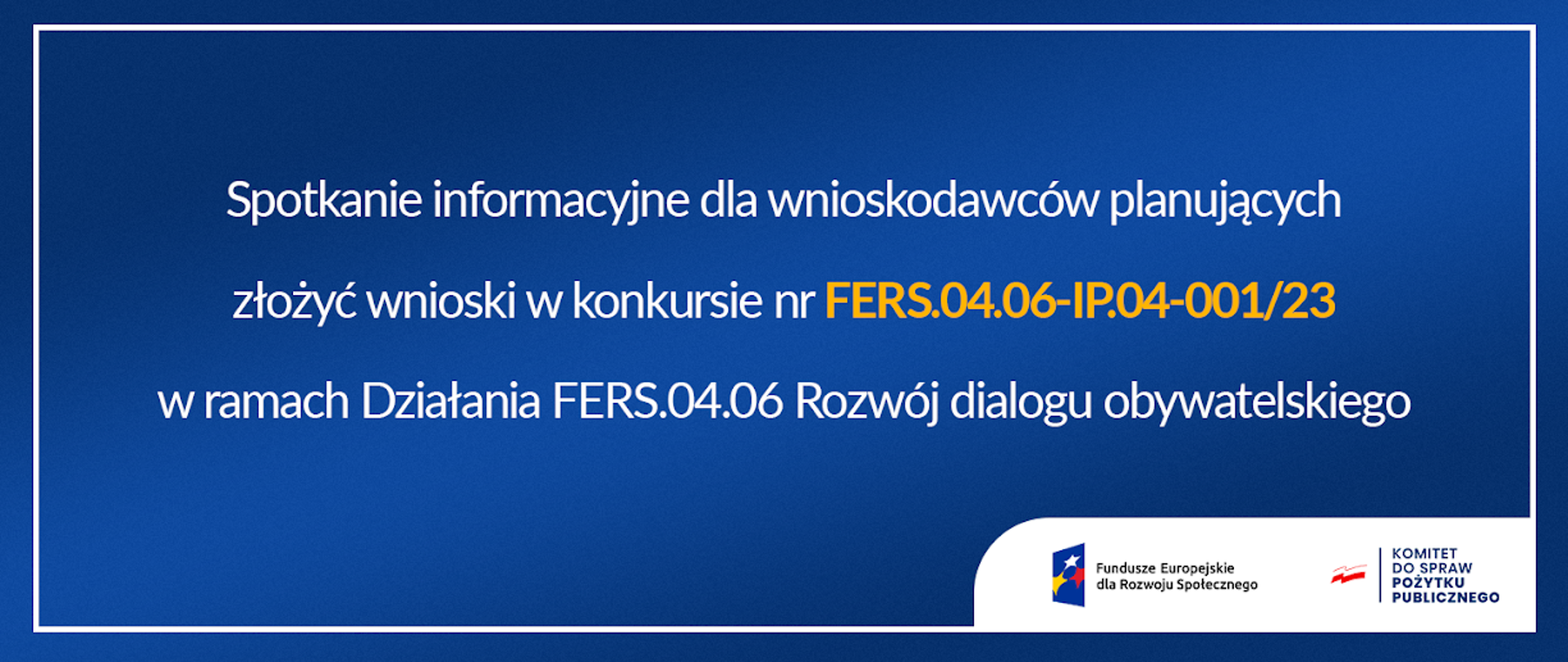 26 lipca 2023 r. w godzinach od 9:30 do 13:30 odbędzie się spotkanie informacyjne dla wnioskodawców planujących złożyć wnioski w konkursie 4.6 Rozwój dialogu obywatelskiego w programie Fundusze Europejskie dla Rozwoju Społecznego (nr FERS.04.06-IP.04-001/23).