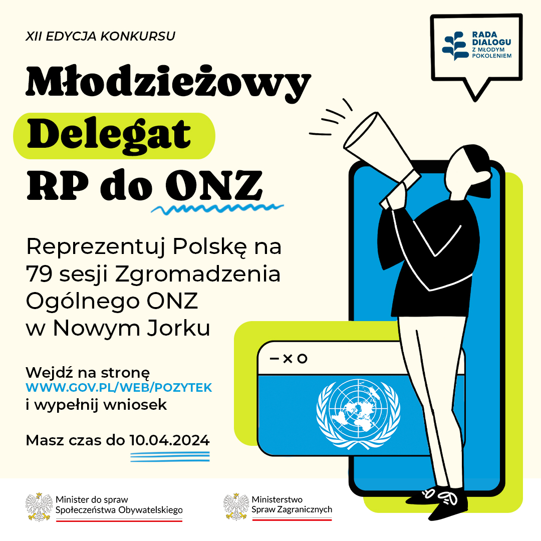 Rada Dialogu z Młodym Pokoleniem – organ doradczy Minister Agnieszki Buczyńskiej Przewodniczącej Komitetu ds. Pożytku Publicznego, przy współpracy z Ministerstwem Spraw Zagranicznych ogłaszają konkurs „Młodzieżowy Delegat RP na 79. Sesję Zgromadzenia Ogólnego ONZ” w Nowym Jorku. Celem konkursu jest wyłonienie osoby, która jako Młodzieżowy Delegat RP weźmie udział w 79. Sesji Zgromadzenia Ogólnego Organizacji Narodów Zjednoczonych oraz będzie uczestniczyła w realizacji i upowszechnianiu założeń Konkursu do kolejnej Sesji Zgromadzenia Ogólnego ONZ.
