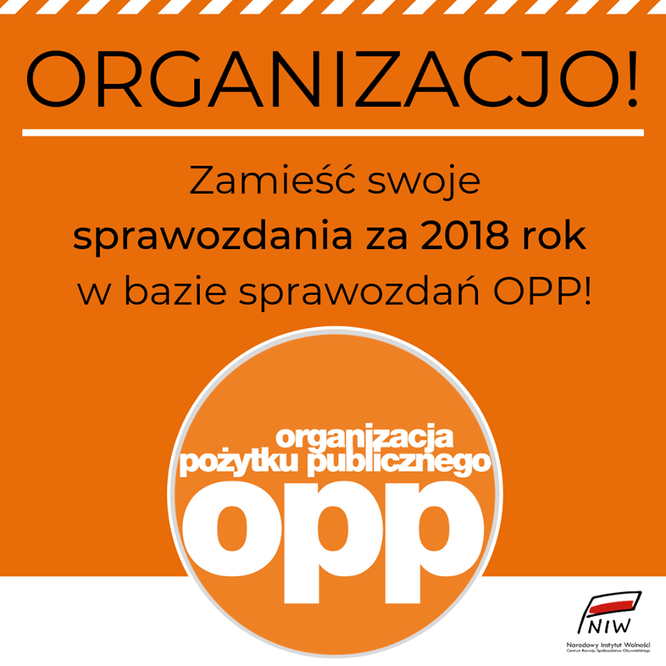 Przypominamy o obowiązku zamieszczenia przez organizacje pożytku publicznego zatwierdzonego sprawozdania finansowego oraz sprawozdania merytorycznego z działalności za cały 2018 rok w bazie sprawozdań organizacji pożytku publicznego www.niw.gov.pl/opp/sprawozdania-opp. Termin na zamieszczenie sprawozdań za 2018 rok upłynął 15 lipca 2019 roku. Jeśli organizacja jeszcze nie dopełniła tego obowiązku, prosimy, aby zrobiła to jak najszybciej.
