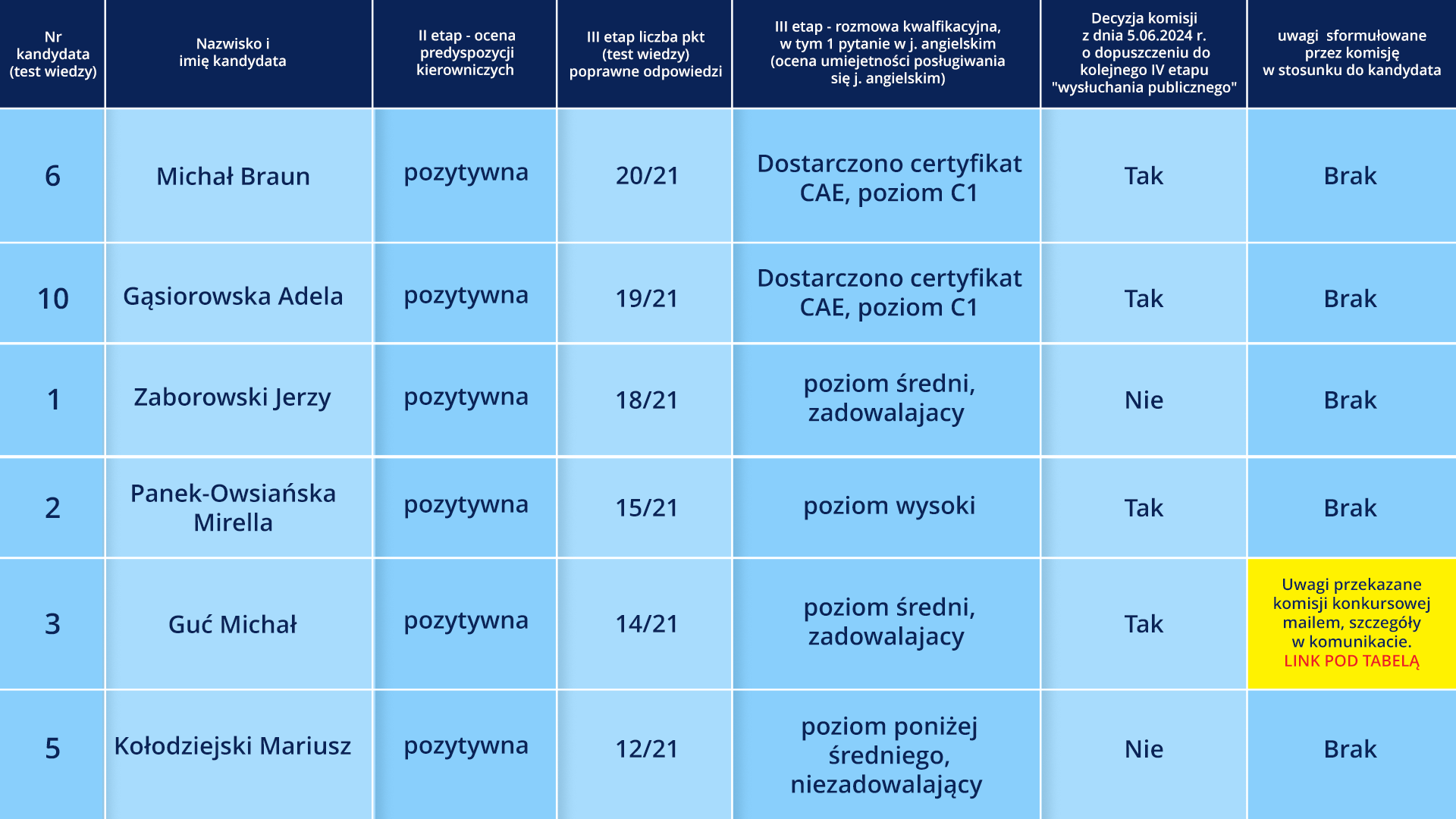 W dniu 11 czerwca 2024 r. o godzinie 15:00 odbyło się wysłuchanie publiczne na stanowisko dyrektora NIW - CRSO. Komisja konkursowa, po obradach z dnia 5 czerwca 2024 r., zakwalifikowała czterech kandydatów: