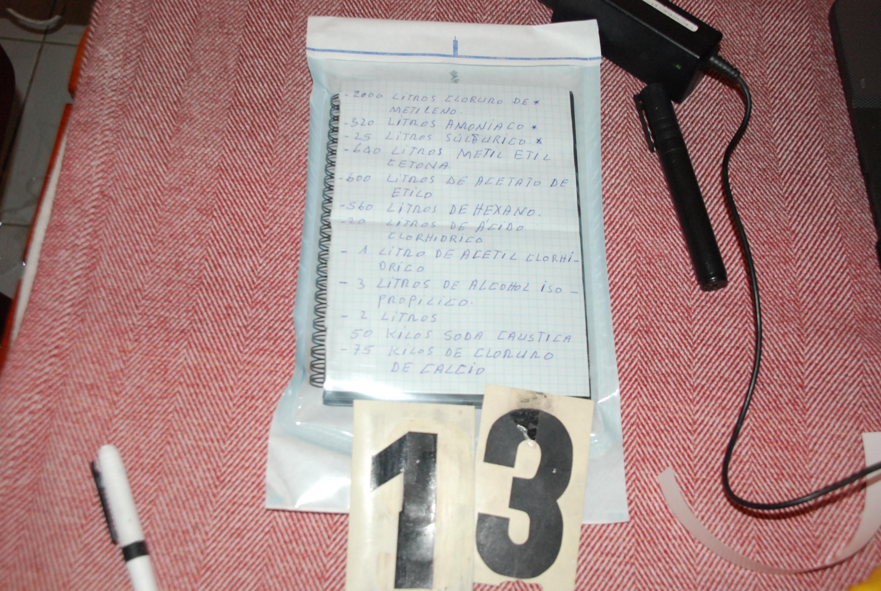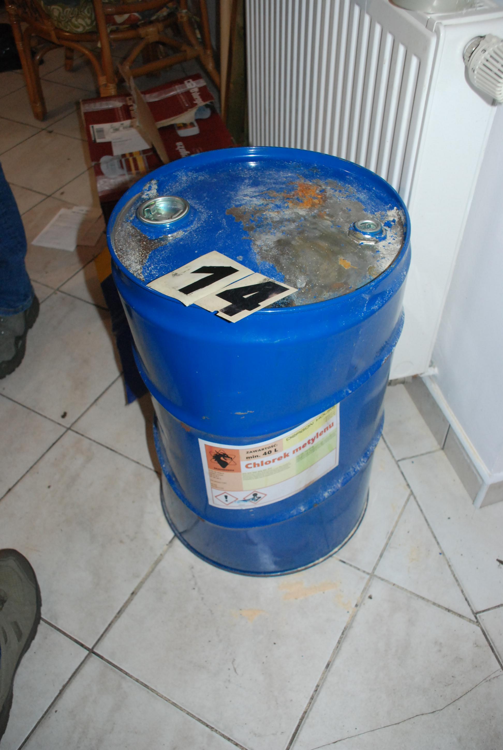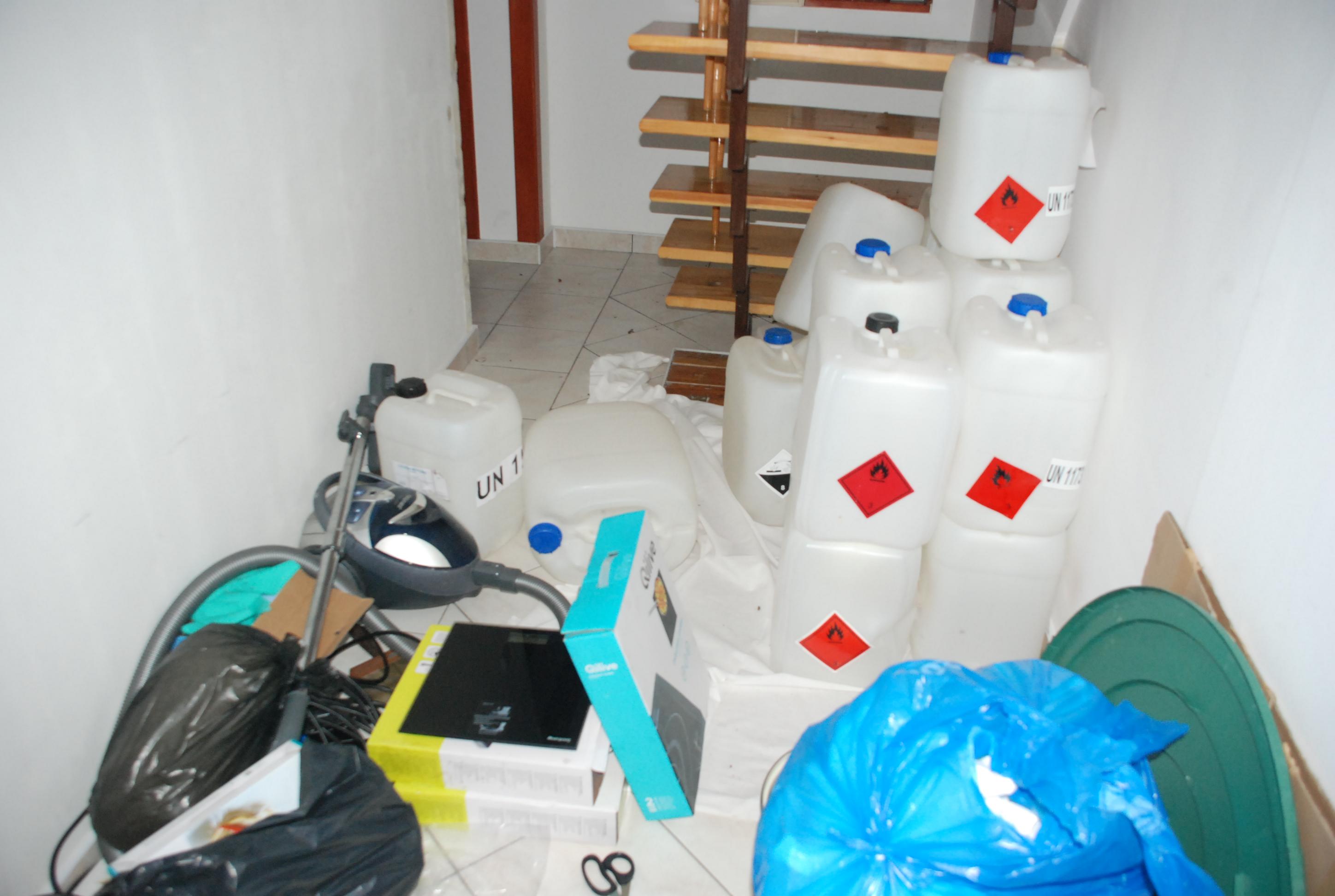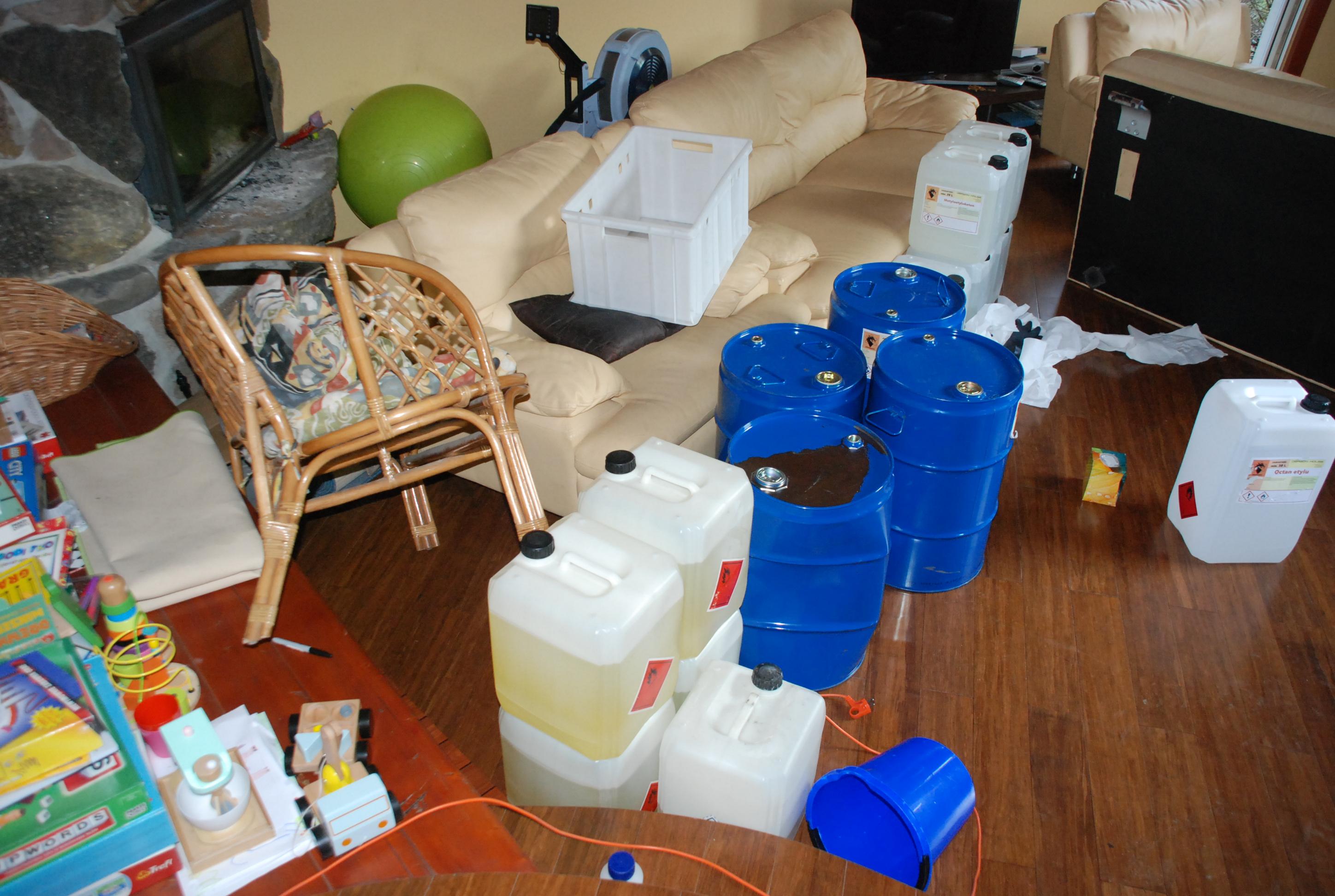 W budynku i na terenie nieruchomości funkcjonariusze CBŚP zabezpieczyli około 10 kilogramów sproszkowanej kokainy (83% czystości), ukrytej w tubie głośnikowej, substancje płynne, z których wyodrębniono około 16 kilogramów kokainy (83% czystości), a ponadto znaczne ilości odczynników chemicznych, między innymi takich jak: „kwas siarkowy”, „kwas chlorowodorowy”, „kwas solny”, „nHeksan”, „metyloetylkoketon”, „octan etylu”, „woda amoniakalna”, „soda kaustyczna” i inne.