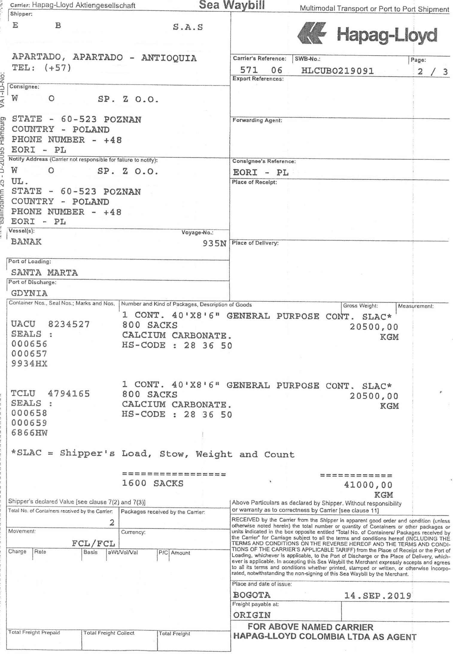 W dniu 8 listopada 2019 r. do portu w Gdyni dotarł ładunek 40 ton substancji opisanej jako „Calcium Carbonate” (węglan wapnia). To popularna, legalna substancja, potocznie określana, jako kreda, produkowana także w Polsce, mająca szerokie zastosowanie w rolnictwie, w budownictwie, w gastronomii, w przemyśle spożywczym, kosmetycznym, papierniczym i innych. Z listu przewozowego wynikało, że nadawcą towaru jest spółka kolumbijska, z siedzibą w Apartadó, a odbiorcą polska spółka, z siedzibą w Poznaniu. Towar był zapakowany w dwóch kontenerach, w 1600 workach, po 25 kg każdy – łącznie 40 ton. Portem wyjścia był port Santa Marta w Kolumbii, a portem wejścia port w Gdyni.