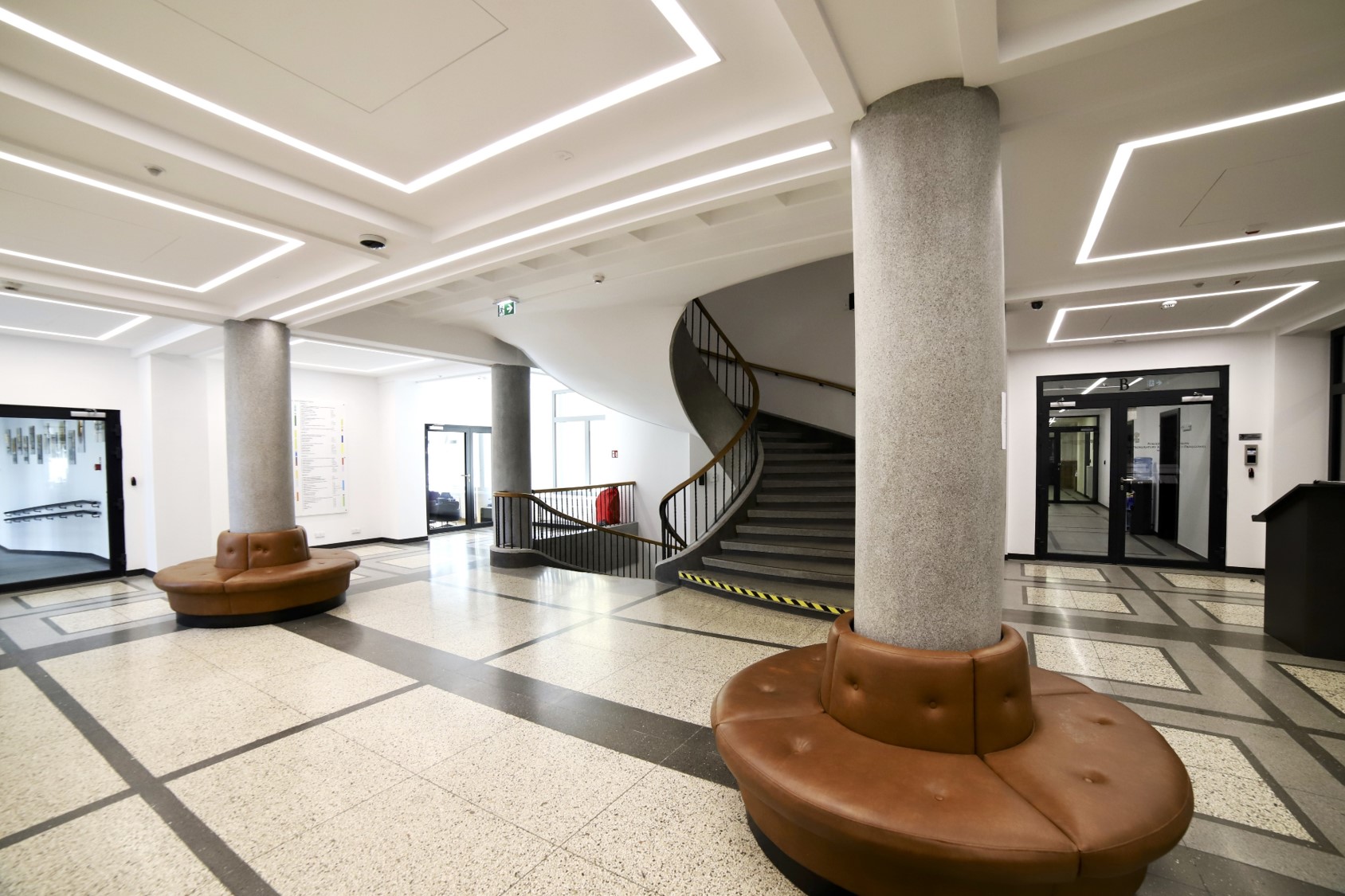 - odrestaurowano elementy będące pod nadzorem konserwatora zabytków takie jak elewacja budynku i okrągłą salę zwaną Rotundą.