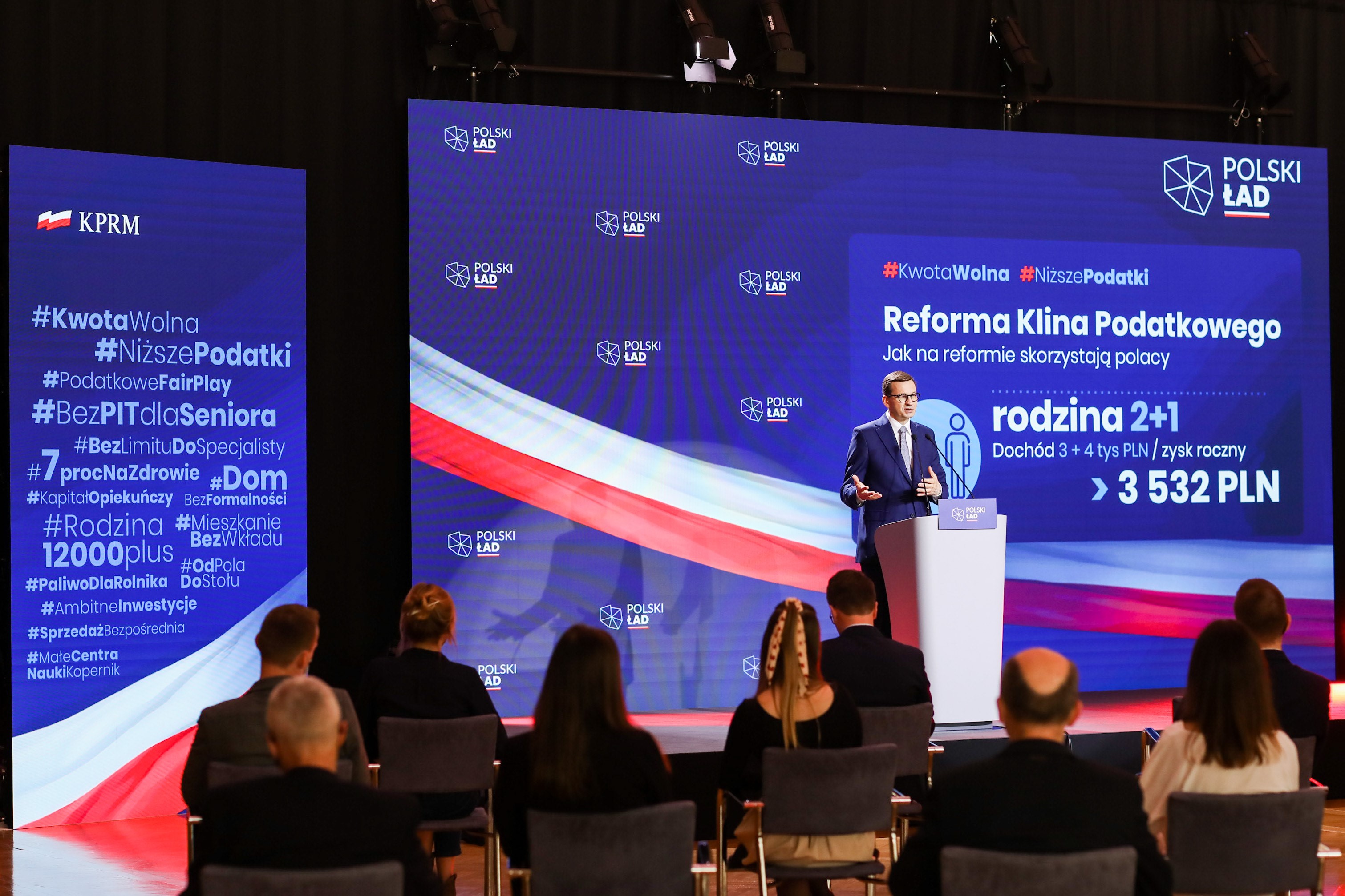 Wśród wielu założeń, znalazły się między innymi korzystne zmiany podatkowe, kwota wolna od podatku podwyższona do 30 tys. zł dla wszystkich, odbudowa służby zdrowia i wsparcie dla rodzin oraz seniorów. – Polski Ład ma trzy zasadnicze cechy - jest kompleksowy, przemyślany i służy całemu społeczeństwu. Służy także tym, którzy są dziś lepiej sytuowani od innych. Przez zmniejszenie nierówności stworzymy lepsze warunki do życia dla wszystkich – podkreślił szef polskiego rządu.