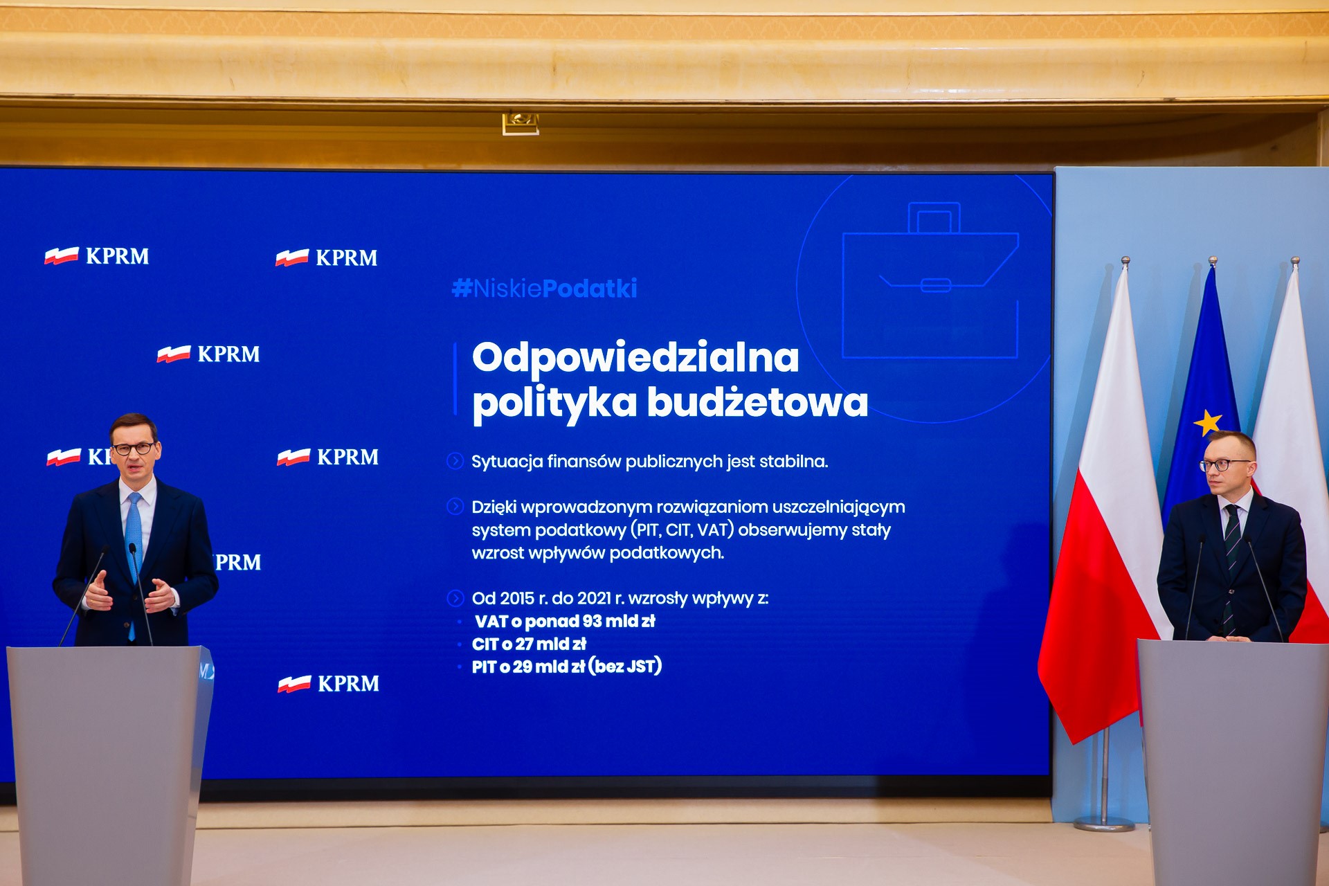 Prowadzimy odpowiedzialną politykę budżetową. Sytuacja finansów publicznych naszego kraju jest stabilna. Dzięki wprowadzonym rozwiązaniom, które uszczelniają system podatkowy, obserwujemy stały wzrost wpływów do budżetu. Od 2015 r. do 2020 r. wpływy z VAT wzrosły o ponad 93 mld zł. Rosną też wpływy z podatku CIT – o 27 mld zł, a także z PIT o ok. 29 mld zł (bez JST).