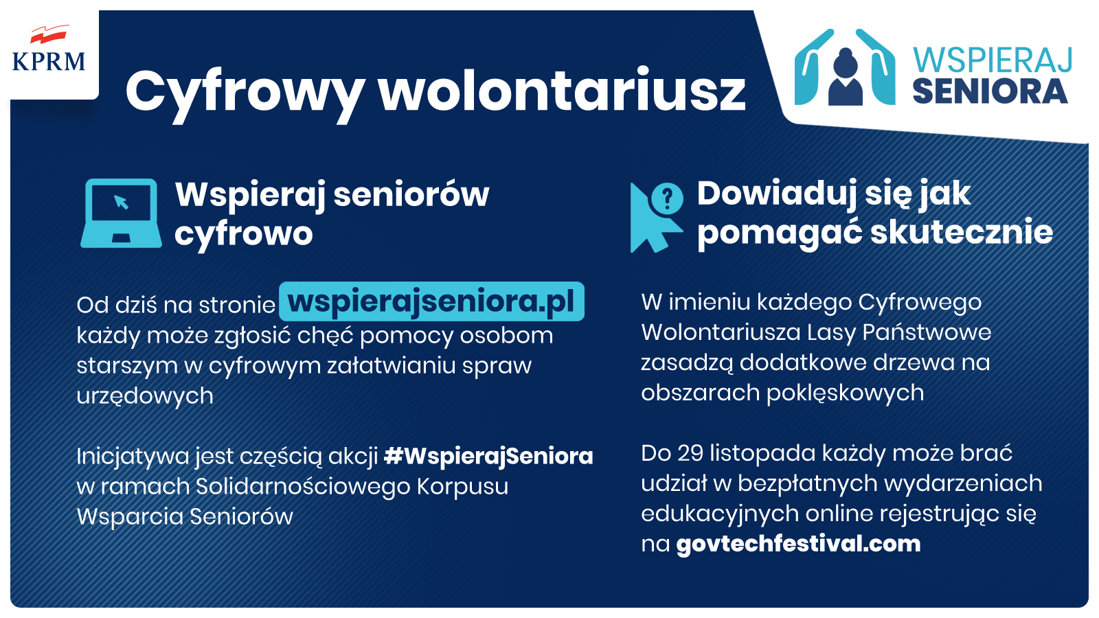 Dlatego też, rozszerzamy dziś Korpus Wsparcia Seniorów o komponent cyfrowy. Zachęcamy zwłaszcza młode osoby, które czują się biegłe w obsłudze narzędzi cyfrowych, aby wyrażały chęć pomocy Seniorom w swoich gminach nie tylko w kwestiach tj. zrobienie zakupów, ale także przy obsłudze komputera, czy założeniu profilu zaufanego, za pomocą którego można komunikować się z administracją. Jako KPRM wyrażamy także gotowość do przeszkolenia każdej osoby, która chciałaby zasilić Korpus Wsparcia Seniorów w zakresie pomocy cyfrowej.