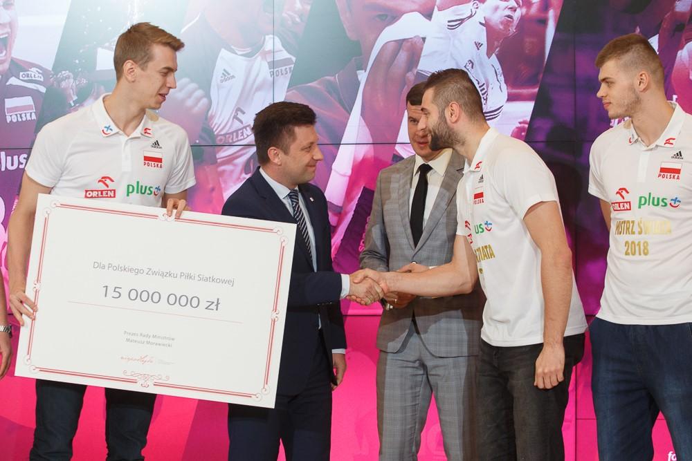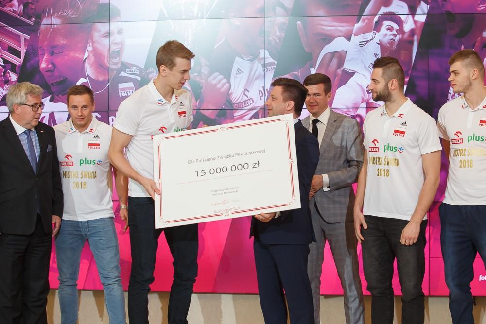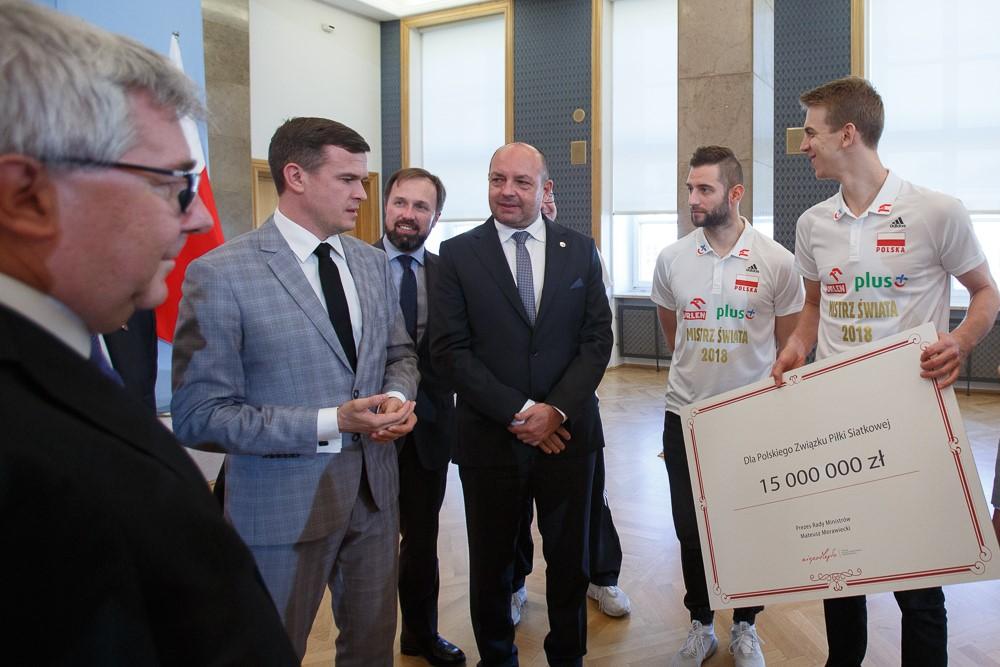 Za pozytywne emocje dla milionów Polaków, energię oraz prezent na stulecie odzyskania niepodległości, premier Mateusz Morawiecki podjął decyzję o przeznaczeniu dodatkowego wsparcia w wysokości 15 mln zł dla Polskiego Związku Piłki Siatkowej – oświadczył Michał Dworczyk szef Kancelarii Prezesa Rady Ministrów podczas spotkania z siatkarzami w KPRM.