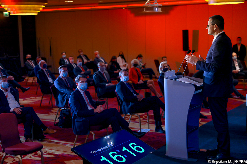„Wszyscy wiedzą, że kryzys związany z koronawirusem stworzył zupełnie nowe środowisko - środowisko niepewności. Środowisko, w którym wiele firm będzie musiało wymyślić pomysł na biznes od nowa” – powiedział premier. Szef rządu zauważył jednak, że Polska zareagowała na kryzys bardzo szybko. Kroki zostały poczynione zaledwie dwa tygodnie po tym, kiedy ogłoszono tzw. lockdown. Dwa tygodnie później niektóre firmy miały już pieniądze na kontach. „Sama procedura była szybka - słyszałem to od przedstawicieli wielu firm” – podkreślił.
