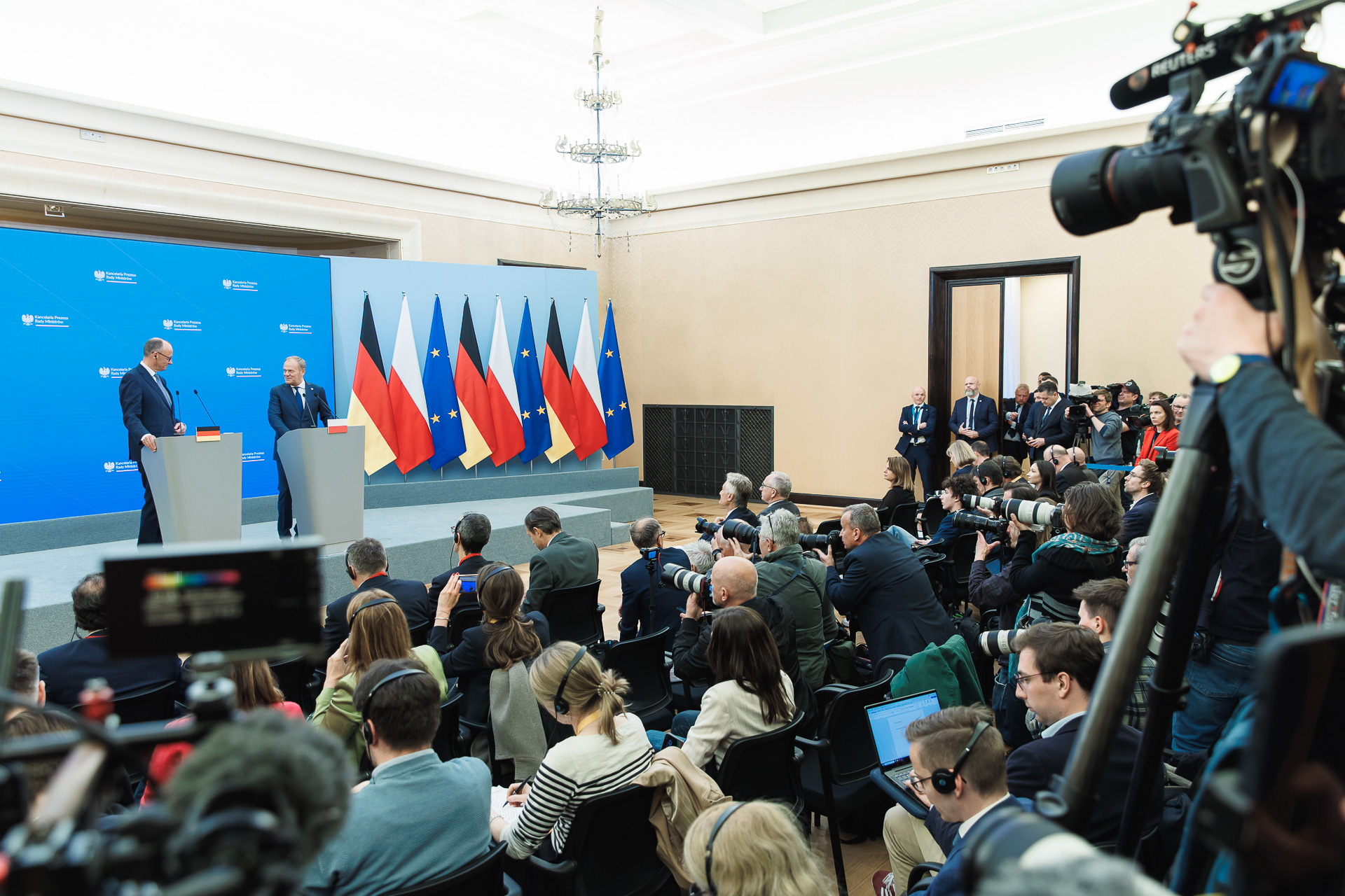 "Jestem optymistą, co do przyszłości relacji polsko-niemieckich" - mówił Premier Donald Tusk po spotkaniu z Kanclerzem Republiki Federalnej Niemiec Friedrichem Merzem w Kancelarii Prezesa Rady Ministrów. Liderzy Polski i Niemiec rozmawiali na temat współpracy i nowego otwarcia w relacjach Warszawy i Berlina. Przywódcy dyskutowali również o bezpieczeństwie, obronie Europy czy wspólnych inwestycjach infrastrukturalnych, np. w kolej dużych prędkości. Kanclerz Friedrich Merz, w swoją pierwszą podróż zagraniczną, tego samego dnia udał się do Paryża i Warszawy.