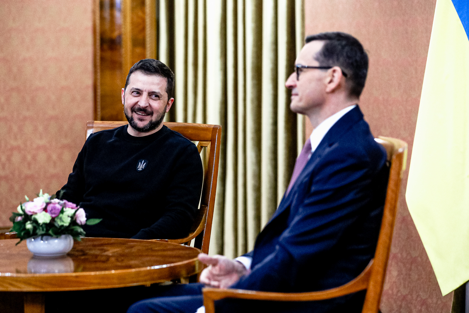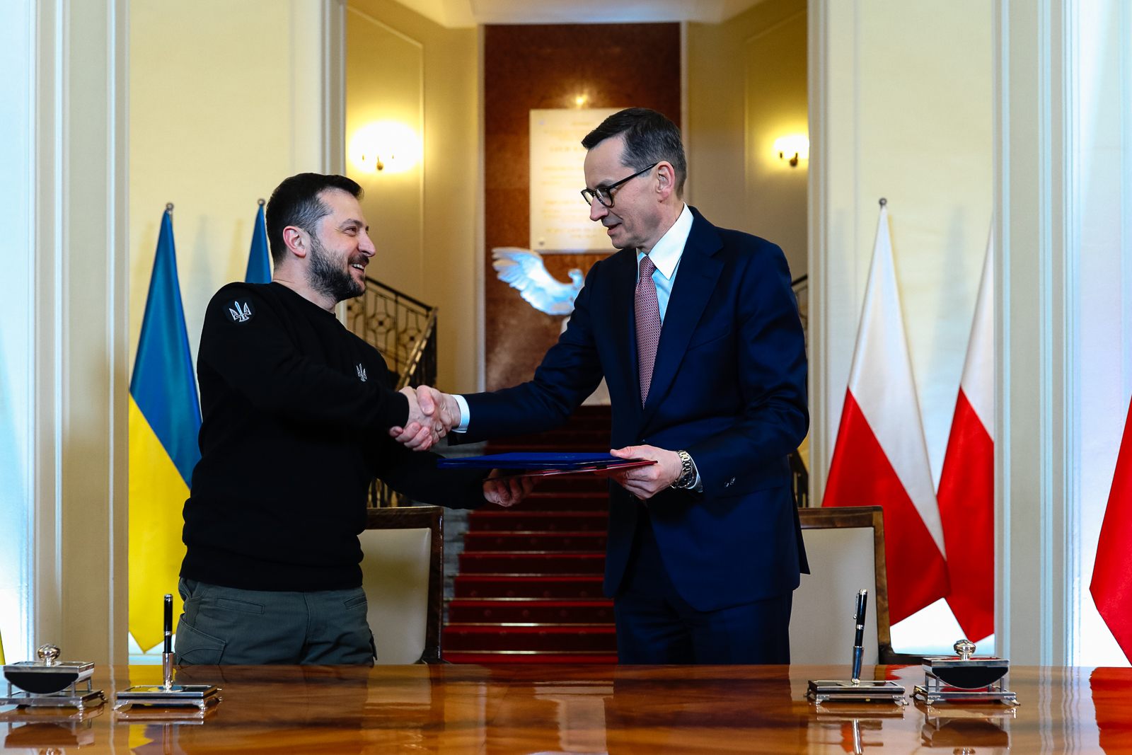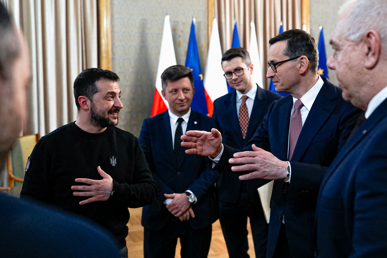 Premier Mateusz Morawiecki spotkał się w Kancelarii Prezesa Rady Ministrów z prezydentem Ukrainy Wołodymyrem Zełenskim. Omówiono bieżące tematy dwustronne oraz kwestie związane z bezpieczeństwem i trwającą agresją rosyjską na Ukrainę. Podpisano 3 dokumenty o zakupie polskiego sprzętu wojskowego, produkcji amunicji i odbudowie zniszczeń wojennych. Szef polskiego rządu rozmawiał również o tranzycie zboża z Ukrainy oraz dalszej integracji Ukrainy z Unią Europejską.