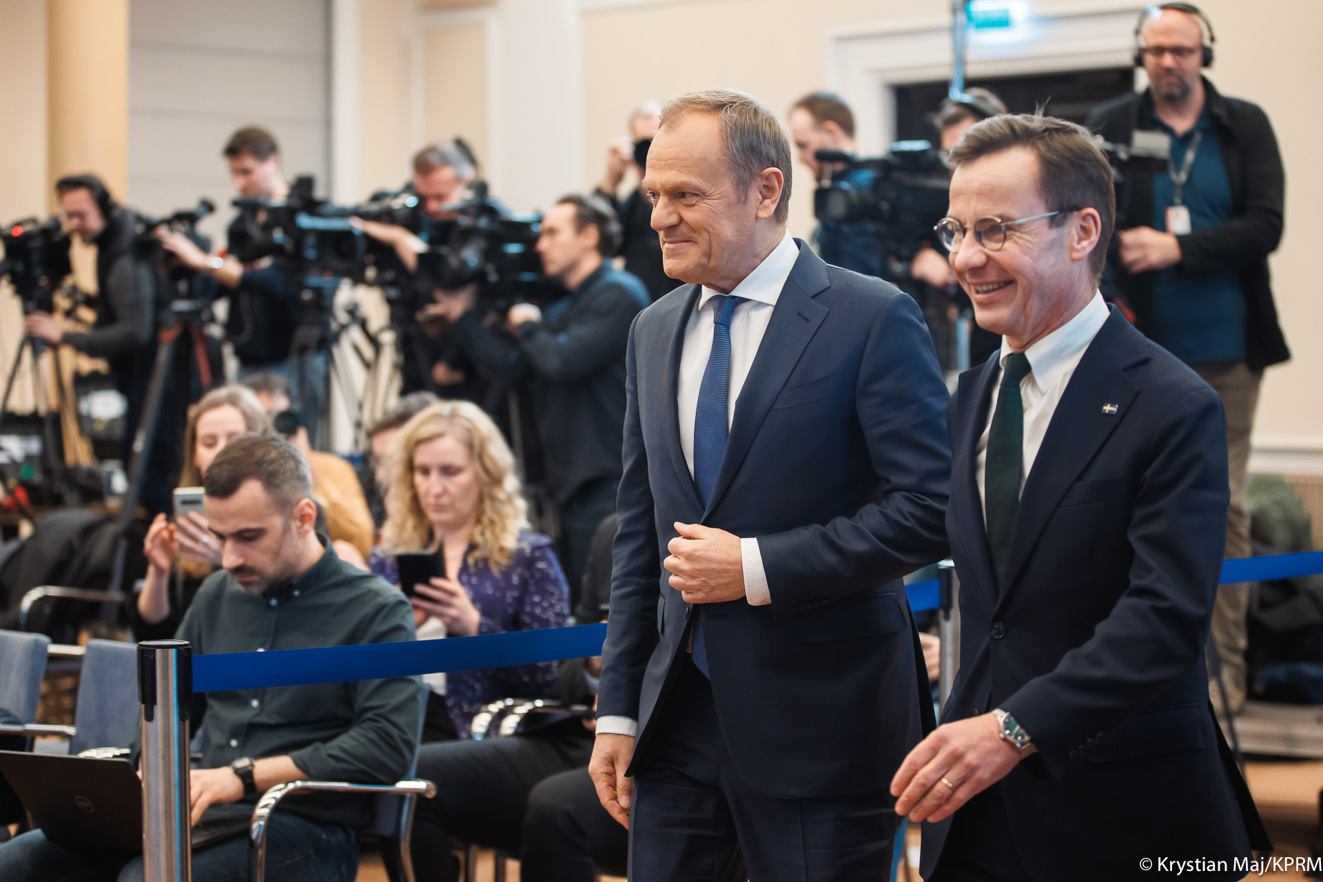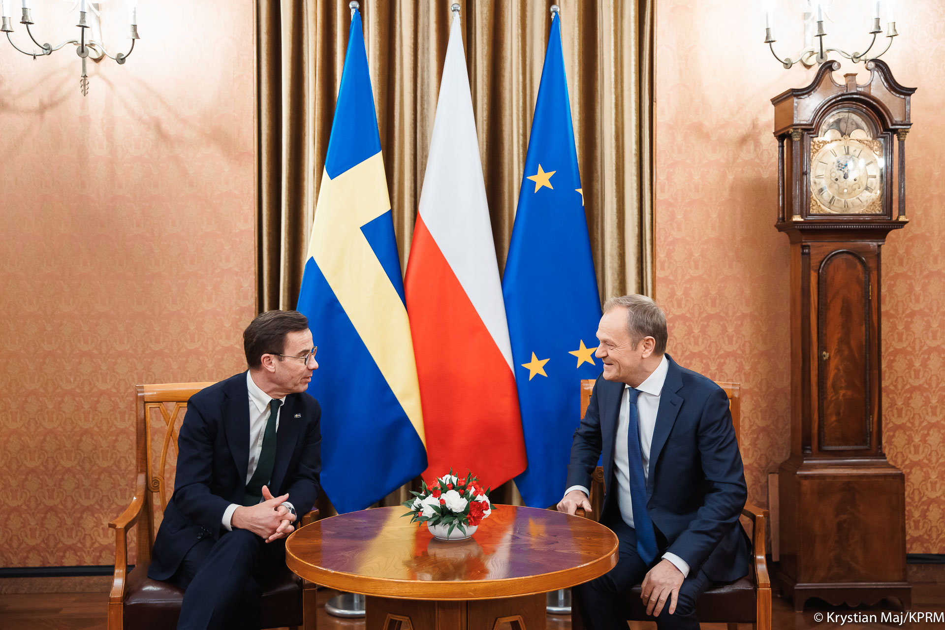 Premier Donald Tusk spotkał się w Kancelarii Prezesa Rady Ministrów z szefem szwedzkiego rządu Ulfem Kristerssonem. Rozmowy dotyczyły bezpieczeństwa i współpracy obronnej zarówno w Europie, jak i bilateralnie pomiędzy Polską i Szwecją. Szefowie rządów omówili także kwestie związane z wojną w Ukrainie oraz zbliżającą się polską prezydencją w Radzie UE. Premier Donald Tusk wyraził pełne poparcie Polski dla obecności Szwecji w NATO.