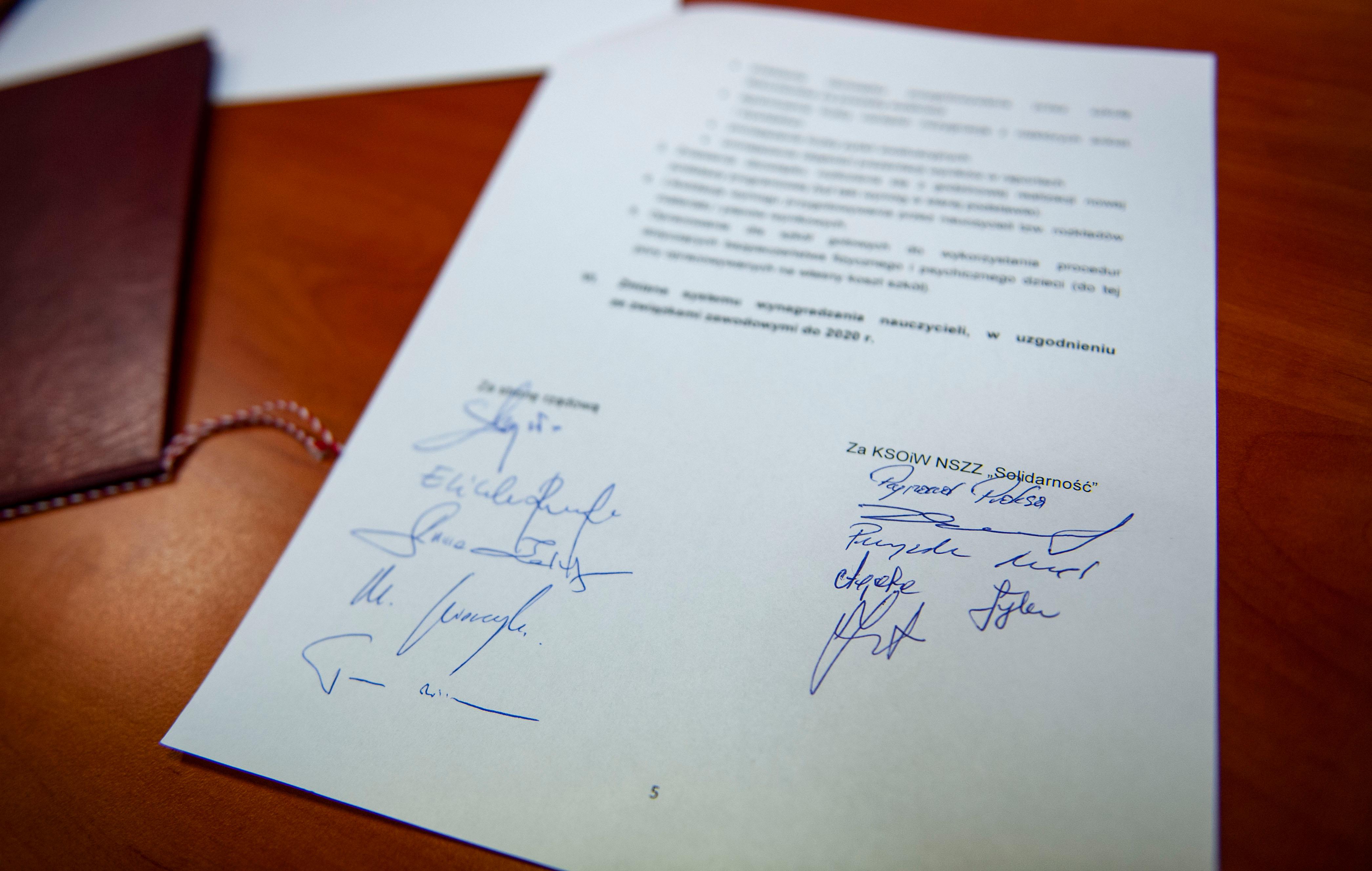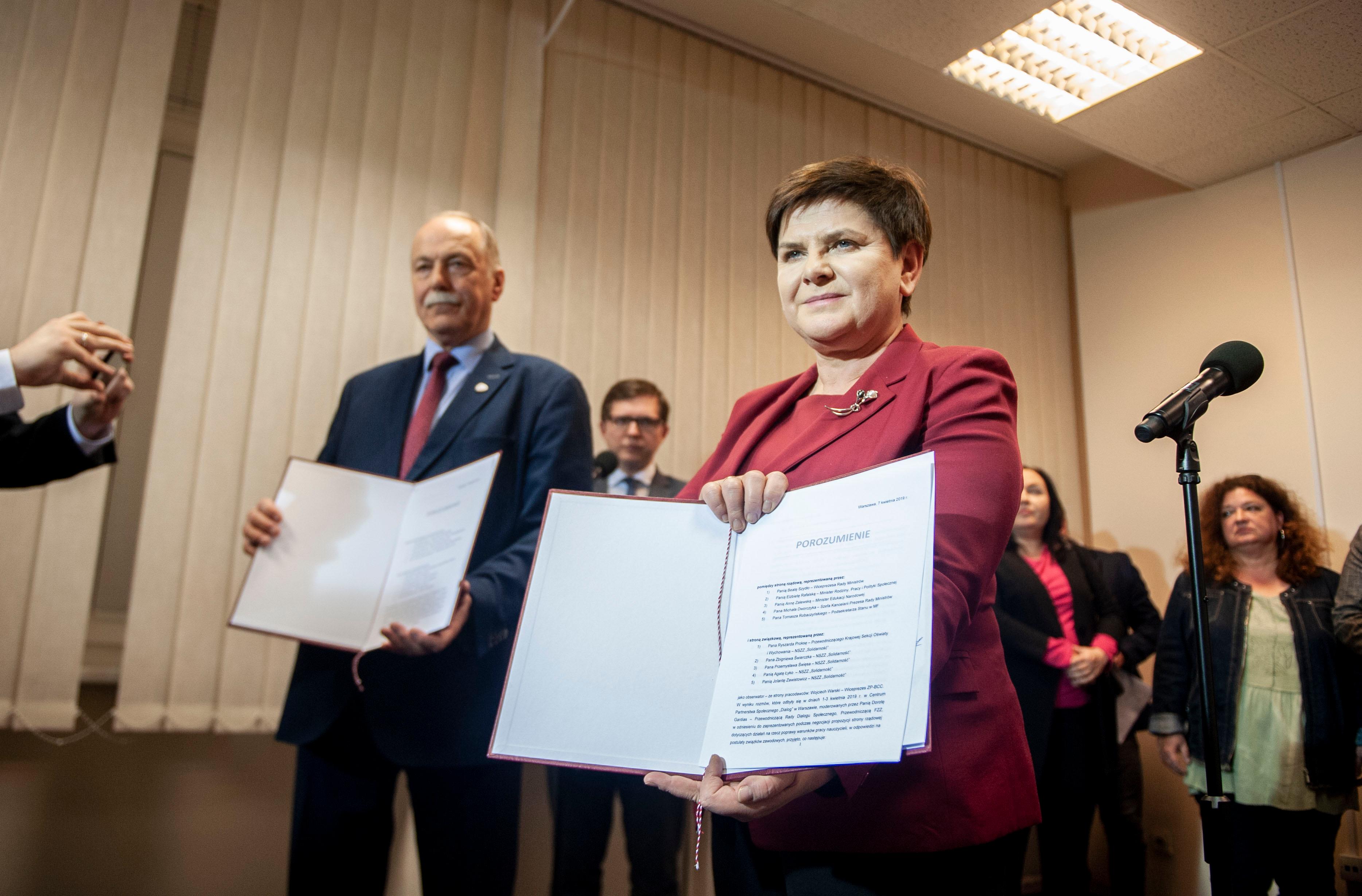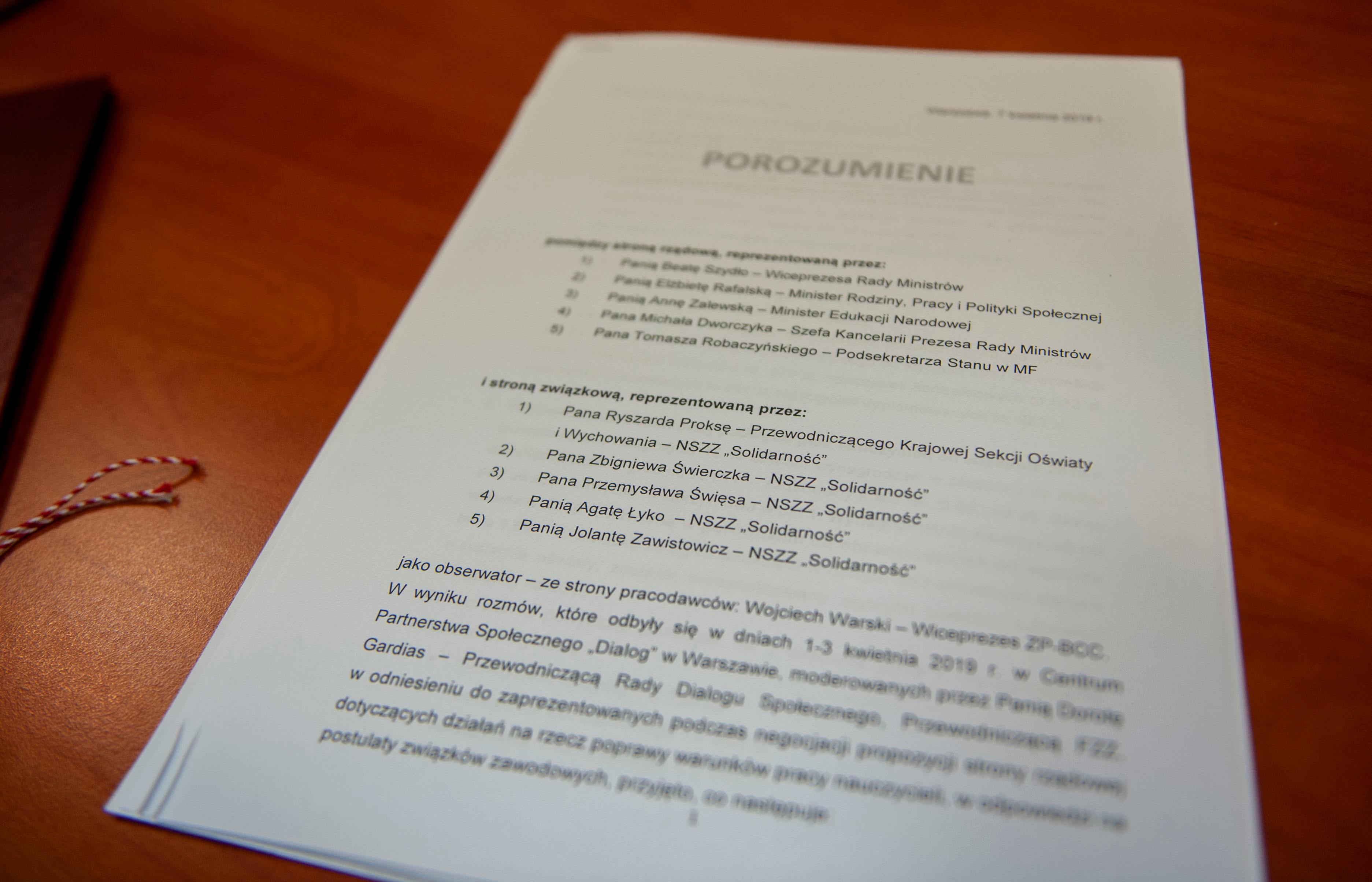 W wyniku rozmów, które odbyły się w dniach 1-3 kwietnia 2019 r. w Centrum Partnerstwa Społecznego „Dialog” w Warszawie, moderowanych przez Panią Dorotę Gardias – Przewodniczącą Rady Dialogu Społecznego, Przewodniczącą FZZ, w odniesieniu do zaprezentowanych podczas negocjacji propozycji strony rządowej dotyczących działań na rzecz poprawy warunków pracy nauczycieli, w odpowiedzi na postulaty związków zawodowych, przyjęto, co następuje: