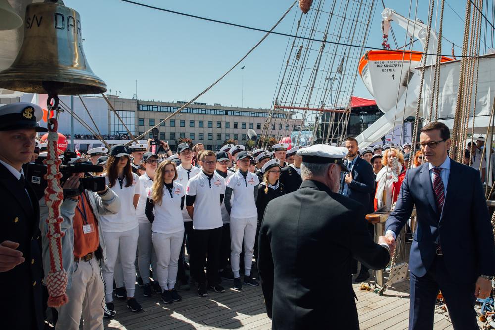 Ta fregata pod pełnymi żaglami niech zachwyca Was swoim pięknem, niech zachwyca cały świat – powiedział szef rządu podczas uroczystości wypłynięcia statku „Dar Młodzieży” w „Rejs Niepodległości” dookoła świata.
