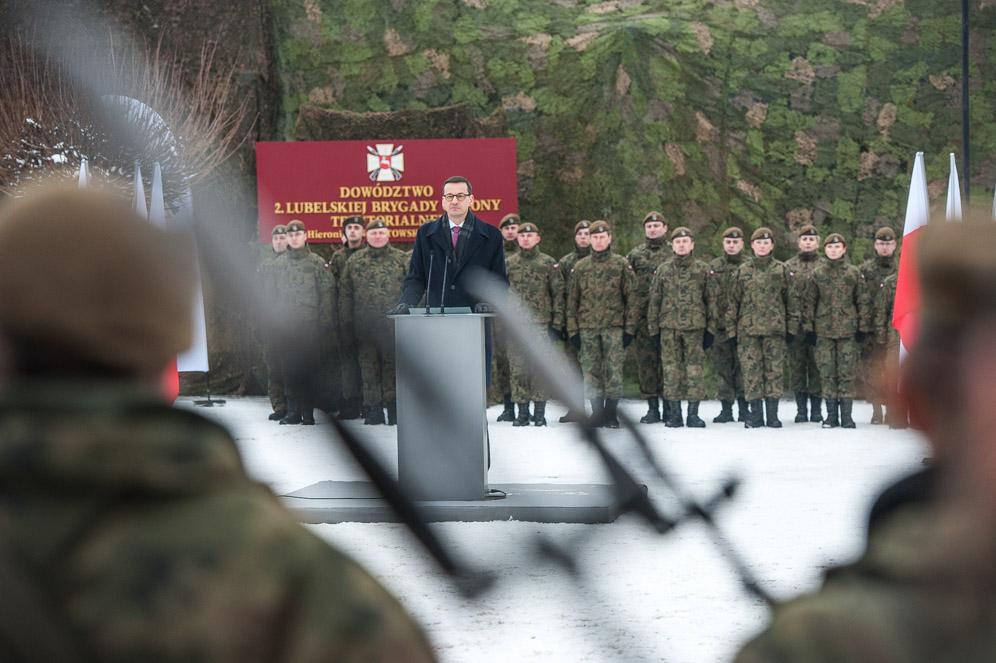 Dziękuję Wam za Wasze decyzje i jestem pewien, że przyczynicie się do utrwalenia bezpieczeństwa państwa polskiego, dzięki temu będziemy mogli budować silną Polskę. Podjęliście się czegoś bardzo ważnego - obrony naszych granic, a w czasach pokoju - pomocy ludziom – mówił premier Mateusz Morawiecki, który uczestniczył w uroczystości złożenia przysięgi wojskowej żołnierzy WOT w 2. Lubelskiej Brygadzie Obrony Terytorialnej im. mjr. Hieronima Dekutowskiego ps. Zapora.
