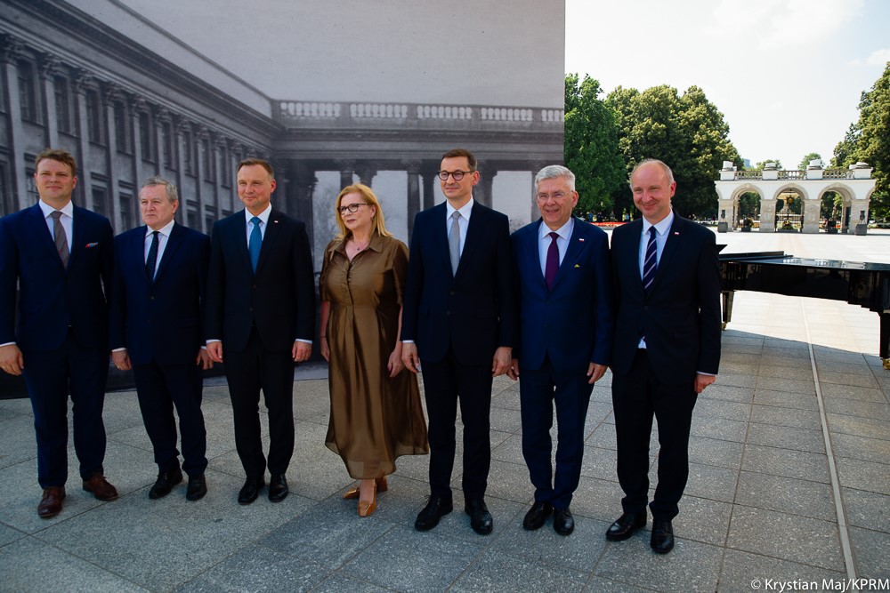 Podczas wystąpienia prezydent podziękował premierowi Mateuszowi Morawieckiemu, za to, że idea odbudowy Pałacu Saskiego, Pałacu Brühla oraz kamienic przy ulicy Królewskiej stała się częścią wielkiego programu Polski Ład.