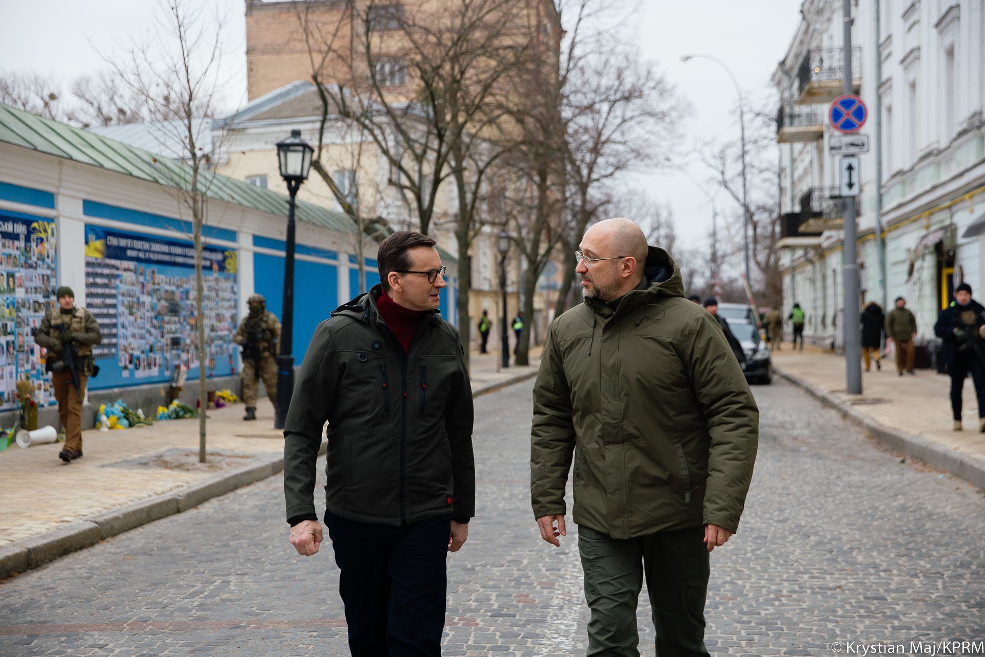 Szefowie polskiego i ukraińskiego rządu złożyli kwiaty pod Ścianą Pamięci Poległych za Ukrainę. Premier Morawiecki z prezydentem Zełenskim odwiedzili w szpitalu żołnierzy, którzy byli na froncie i walczyli za wolność nie tylko Ukrainy, ale także całej Europy. Szef polskiego rządu spotkał się także z pracownikami Ambasady Rzeczypospolitej Polskiej w Kijowie i podziękował im za pracę przez ostatni rok.