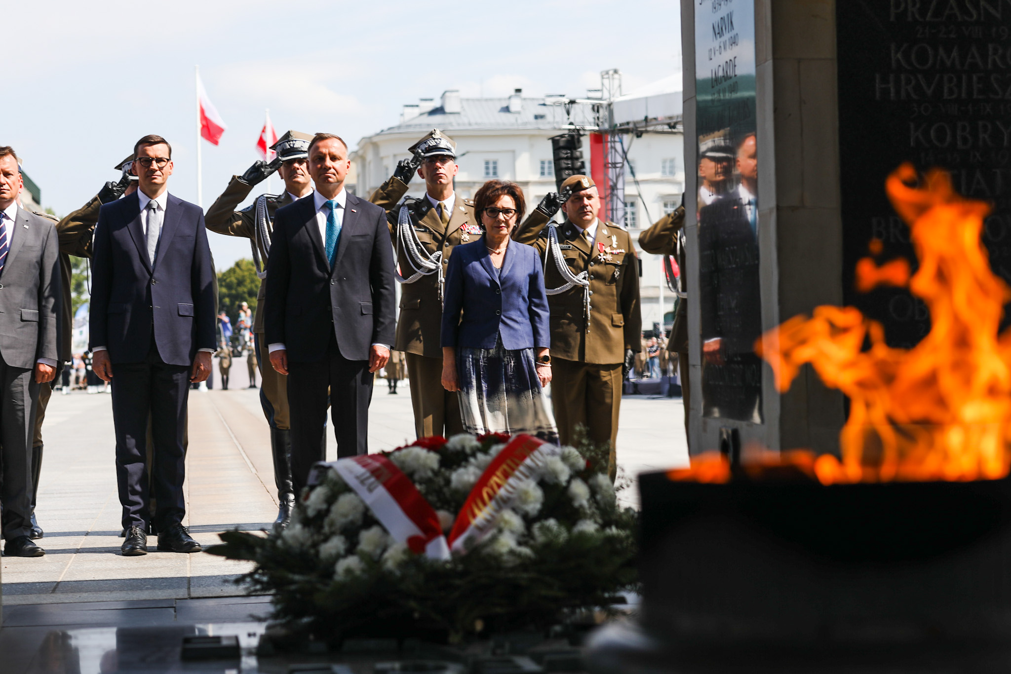 Premier Mateusz Morawiecki uczcił pamięć marszałka Józefa Piłsudskiego. Szef rządu złożył kwiaty pod pomnikiem na Placu Piłsudskiego oraz pod pomnikiem przy Belwederze.