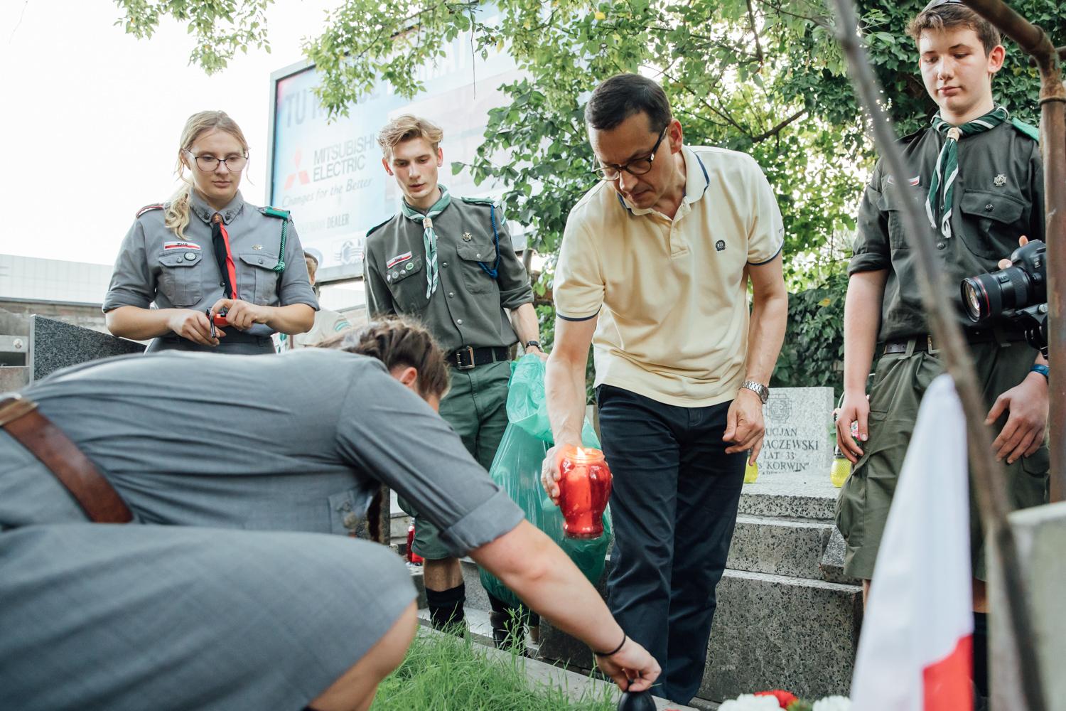 Premier Mateusz Morawiecki z harcerzami na grobach Powstańców Warszawskich