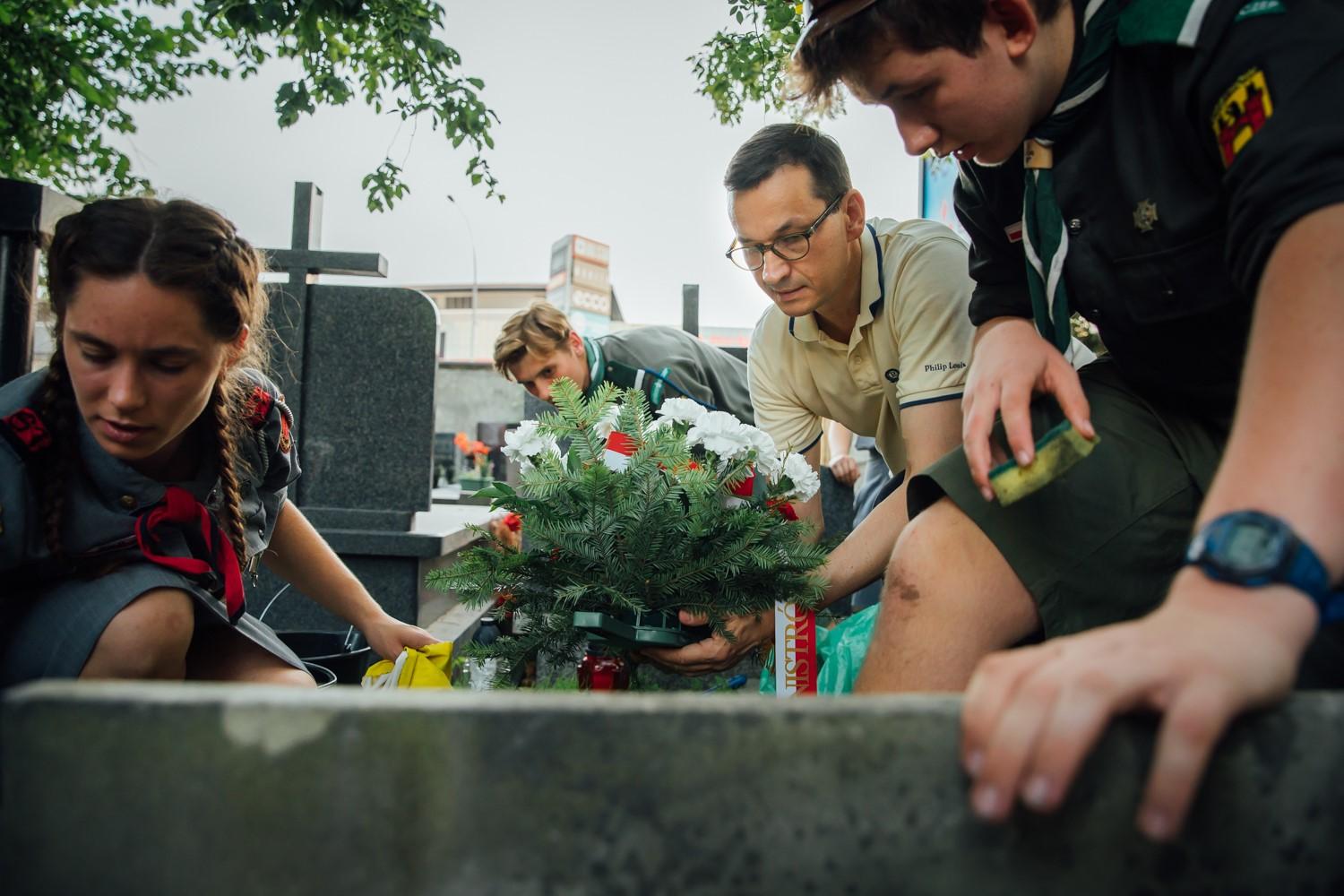 W poniedziałek popołudniu premier Mateusz Morawiecki wraz z harcerzami porządkował groby powstańcze na Cmentarzu Czerniakowskim na warszawskiej Sadybie.