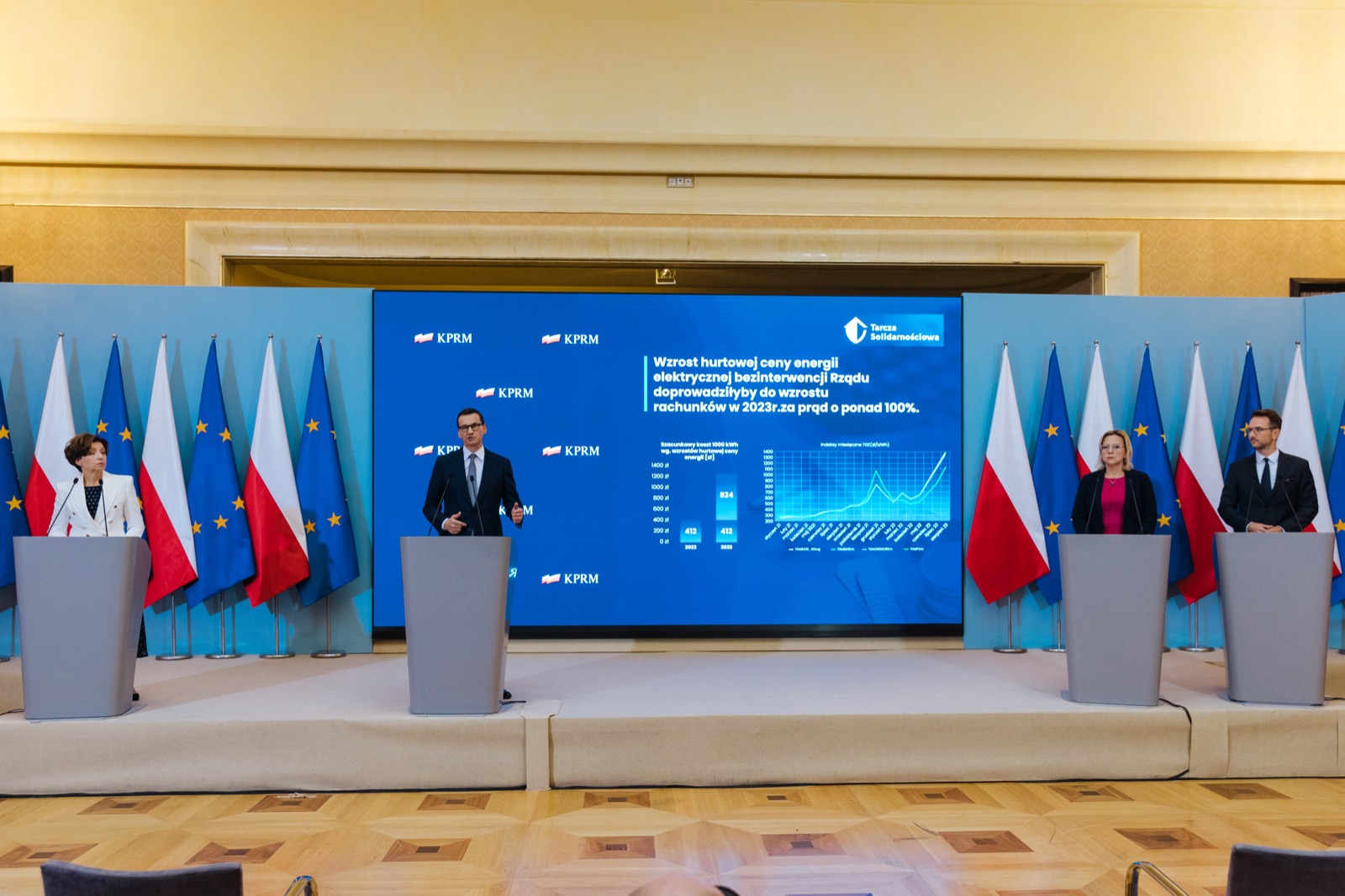 Premier Mateusz Morawiecki zaprezentował Tarczę Solidarnościową. Projekt ten ma na celu zabezpieczyć polskie rodziny oraz przedsiębiorstwa przed kilkukrotnymi wzrostami cen w 2023 r. Będzie to możliwe dzięki wprowadzeniu gwarantowanej ceny za energię elektryczną. Dodatkowo rząd zapowiedział wprowadzenie obowiązkowego oszczędzania energii elektrycznej w administracji o 10 proc. od 1 października 2022 r.