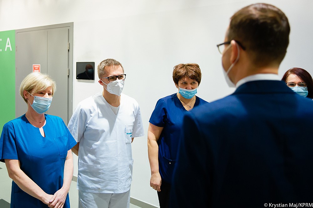 Podczas wizyty w szpitalu rezerwowym w hali EXPO w Krakowie premier Mateusz Morawiecki podkreślił, że ponad 50 proc. zakażeń COVID-19 jest efektem wirusa brytyjskiego, który jest znacznie bardziej zaraźliwy i prowadzi do większej liczby zgonów. „Dlatego ważne jest, żebyśmy jak najszczerzej przeprowadzili akcję szczepień” – zaznaczył szef rządu. „Bardzo ważny jest tu dzisiejszy komunikat wydany przez Europejską Agencję Leków, który mówi, że szczepionka AstraZeneca jest bezpieczna” – dodał.