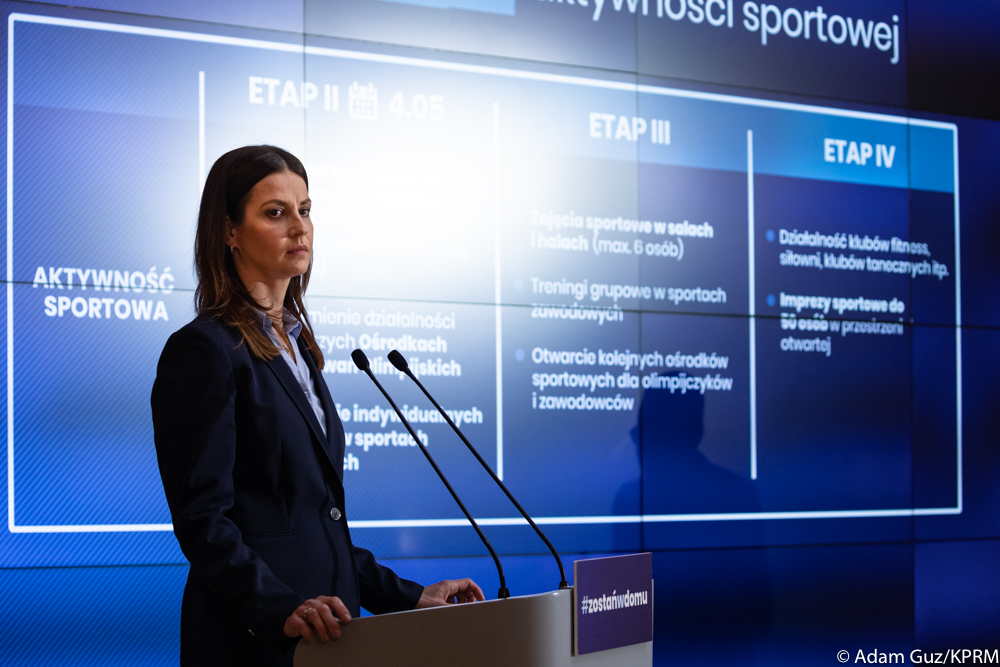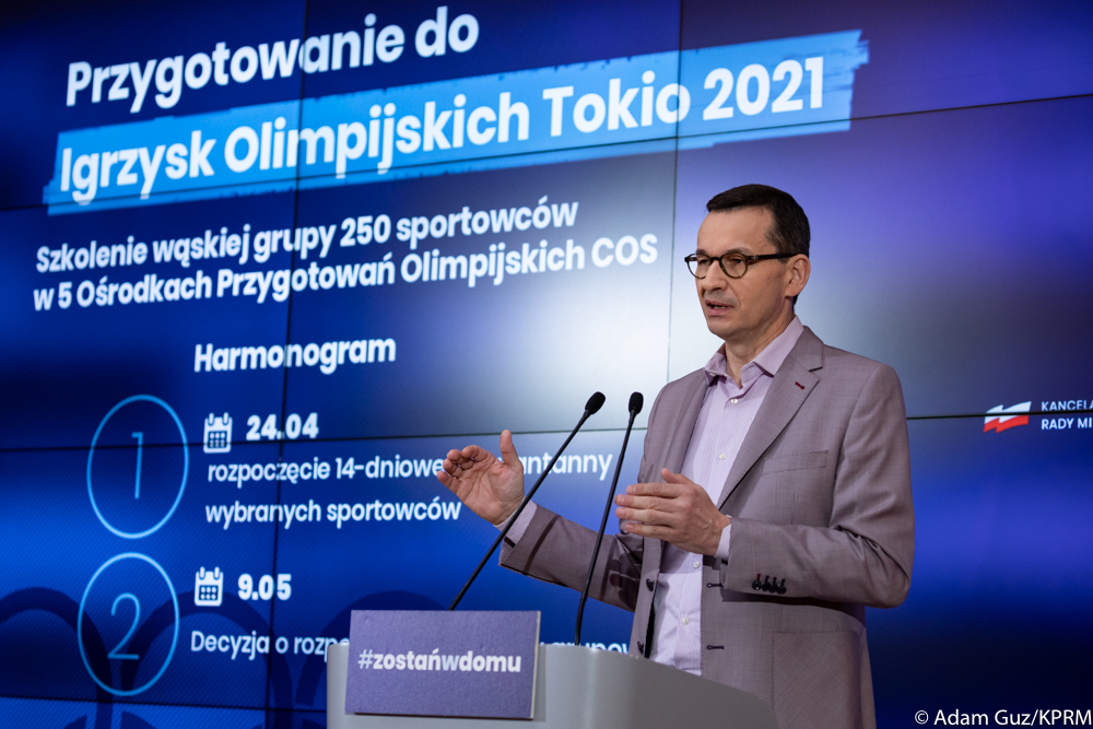 4 maja otwarte zostaną niektóre obiekty sportowe. Rozgrywki piłkarskiej ekstraklasy będą wznowione 29 maja, a żużlowej ekstraligi 12 czerwca. Sportowcy przygotowujący się do Igrzysk Olimpijskich w Tokio będą mogli korzystać z Ośrodków Przygotowań Olimpijskich w Spale i Wałczu.