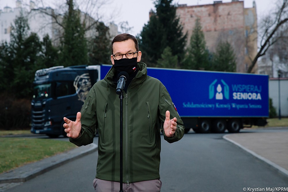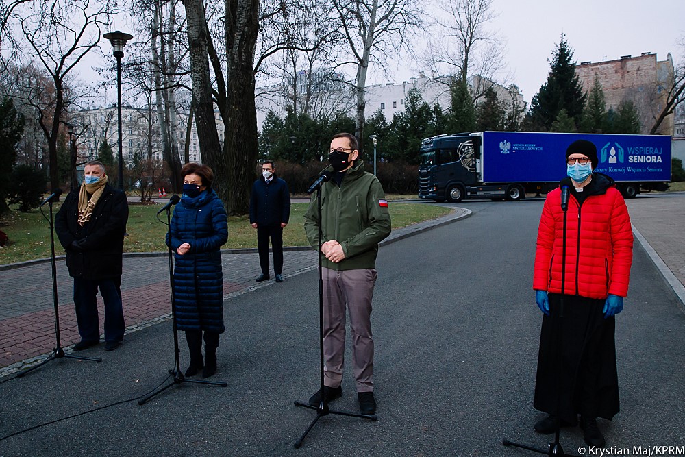 - Dla nas niezwykle ważne jest to, żebyśmy wszyscy jako Polacy przeżyli te Święta możliwie bezpiecznie - powiedział premier Mateusz Morawiecki. - Bezpiecznie to znaczy w odosobnieniu, bez dużych spotkań towarzyskich. Dlatego dziś przygotowaliśmy specjalny konwój wsparcia dla seniorów. To wiele ton żywności i różnych artykułów, które trafiają do osób starszych, osób bezdomnych, ale także do matek z dziećmi – dodał.