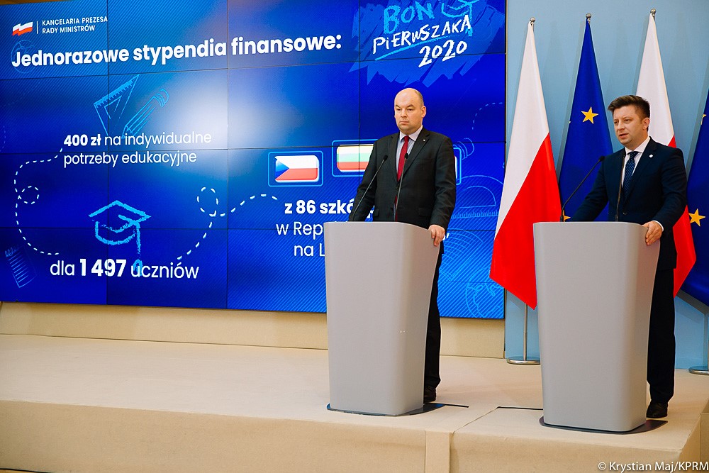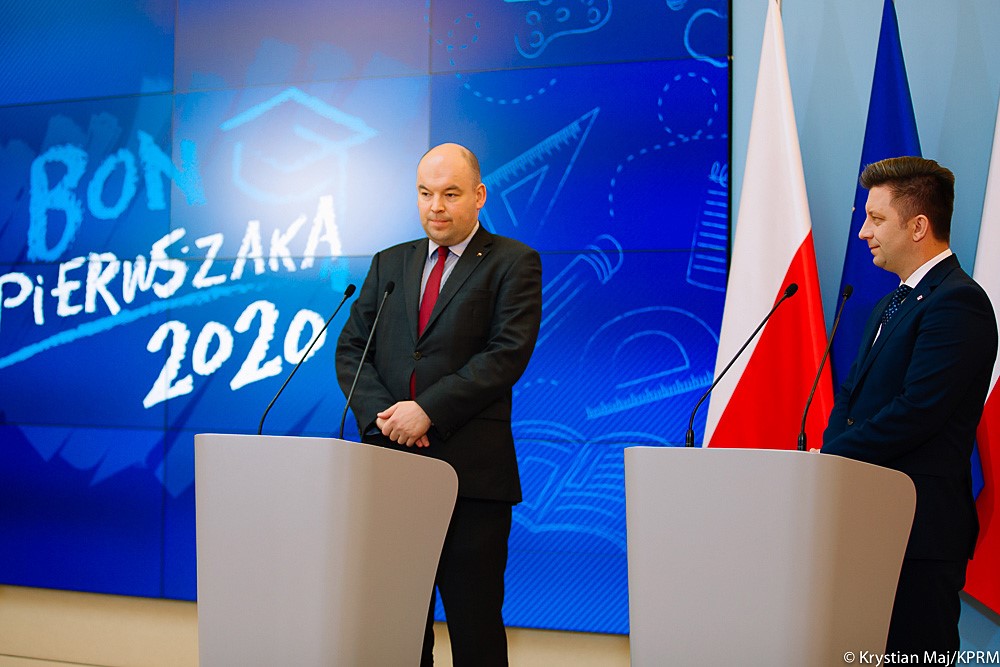 Szef Kancelarii Prezesa Rady Ministrów Michał Dworczyk i sekretarz stanu, pełnomocnik rządu do spraw Polonii i Polaków za Granicą Jan Dziedziczak wraz z prezesem Fundacji „Pomoc Polakom na Wschodzie” Mikołajem Falkowskim przedstawili tegoroczną edycję projektu „Bon Pierwszaka” oraz podsumowanie jego realizacji w latach ubiegłych.