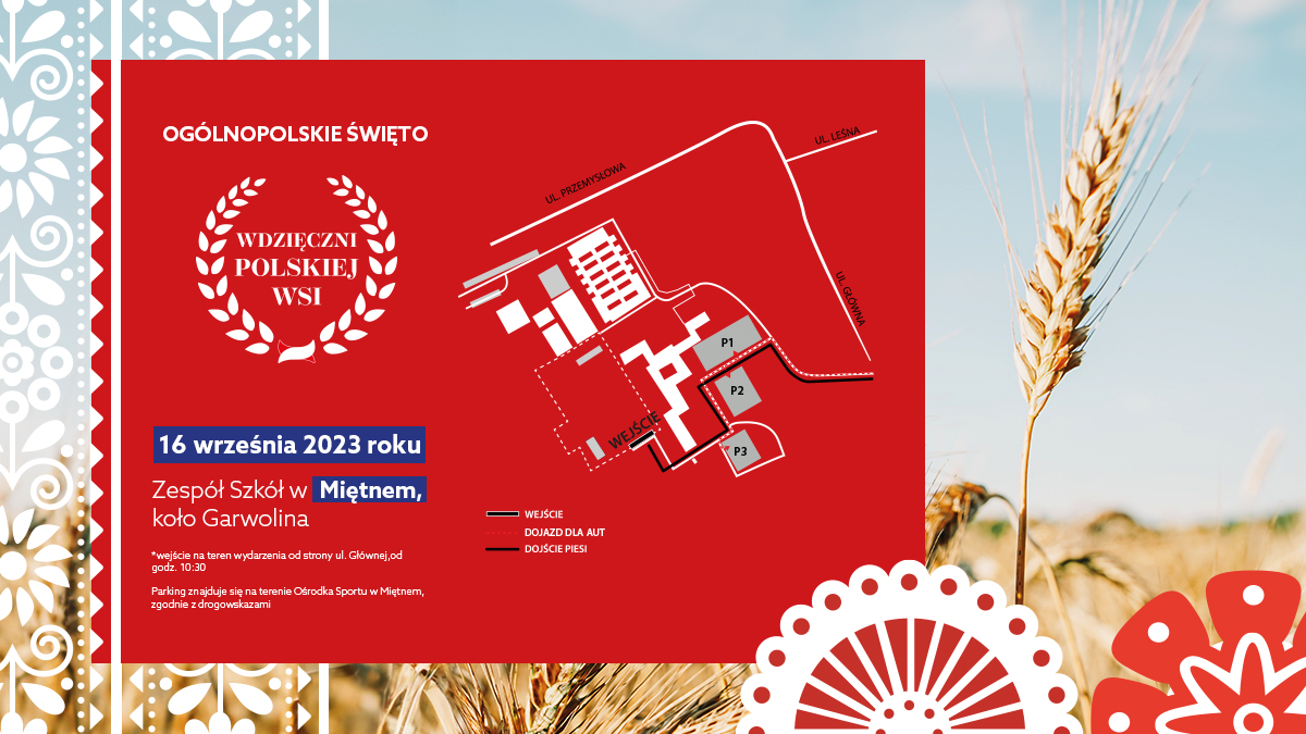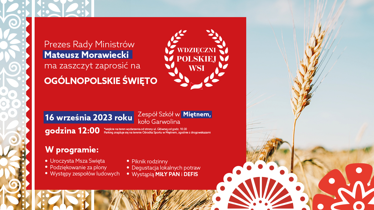 Premier Mateusz Morawiecki zaprasza wszystkich mieszkańców Polski do wspólnego świętowania podczas VI Ogólnopolskiego Święta Wdzięczni Polskiej Wsi. Wydarzenie odbędzie się już w najbliższą sobotę we wsi Miętne koło Garwolina. Obchody rozpoczniemy o godzinie 12:00 na terenie Zespołu Szkół im. Stanisława Staszica w Miętnem. Pomysłodawcą wydarzenia, organizowanego od 2018 roku, jest premier Mateusz Morawiecki. To okazja do wyrażenia wdzięczności polskim rolnikom za zapewnienie bezpieczeństwa żywnościowego. Serdecznie zapraszamy!