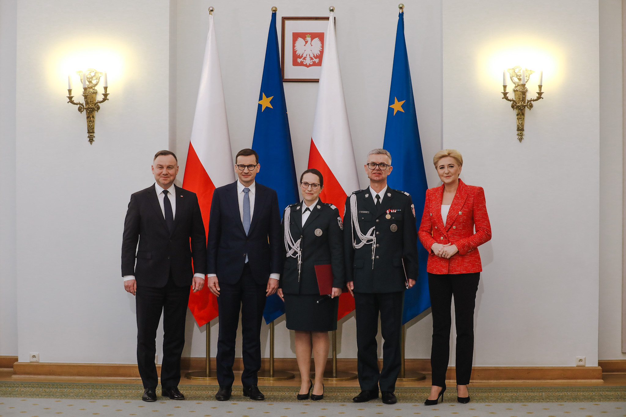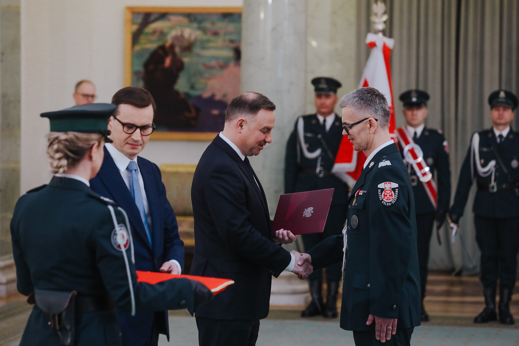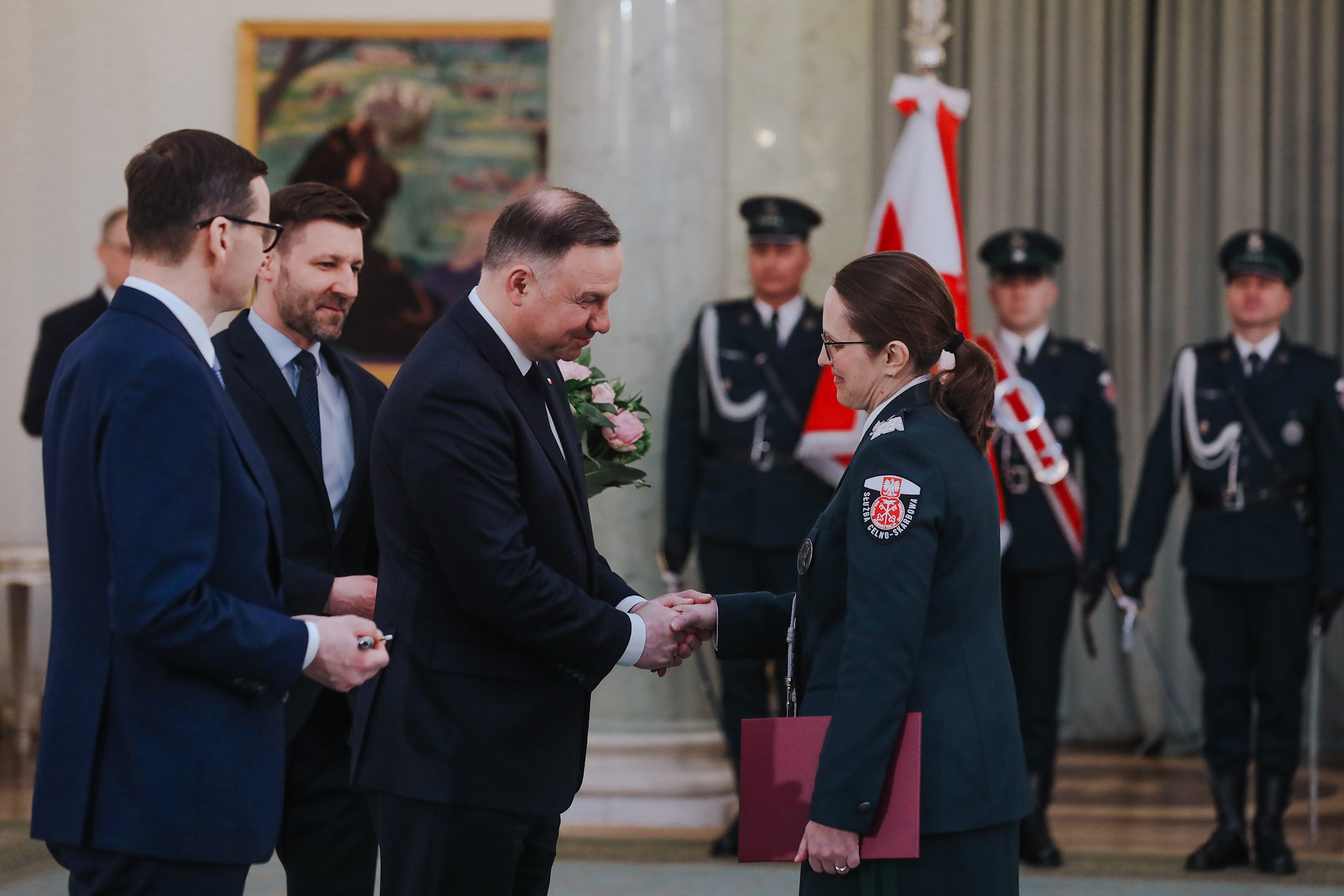 Podczas uroczystości w Pałacu Prezydenckim, prezydent Andrzej Duda wręczył akty mianowania na stopień nadinspektora Służby Celno-Skarbowej. Szef polskiego rządu przekazał funkcjonariuszom pamiątkowe kordziki honorowe.