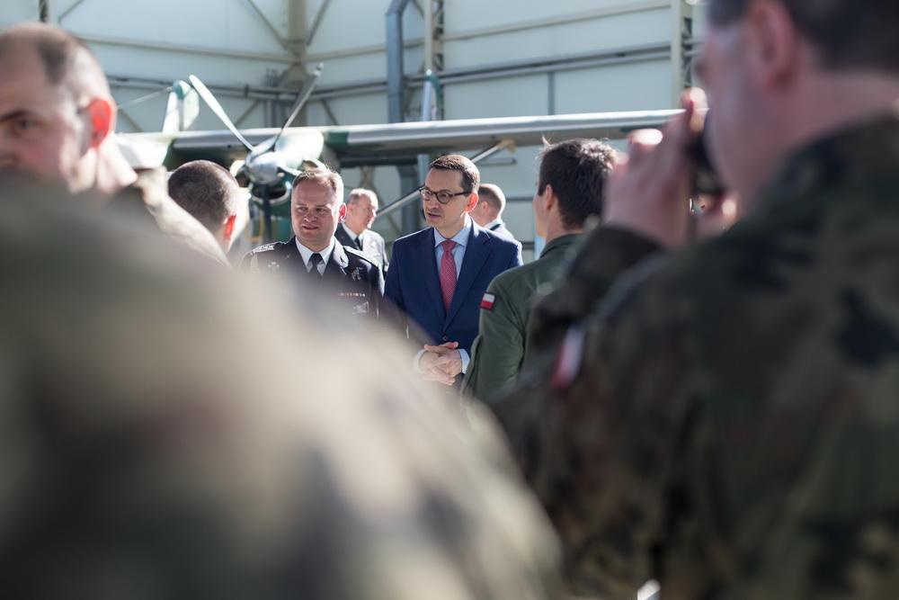 Podczas spotkania premier wspomniał także patrona krakowskiej bazy lotnictwa – słynnego pilota płk pil. Stanisława Jakuba Skarżyńskiego, który jako pierwszy przeleciał Atlantyk. Jak mówił, To jest jedna z wielkich, polskich postaci do naśladowania