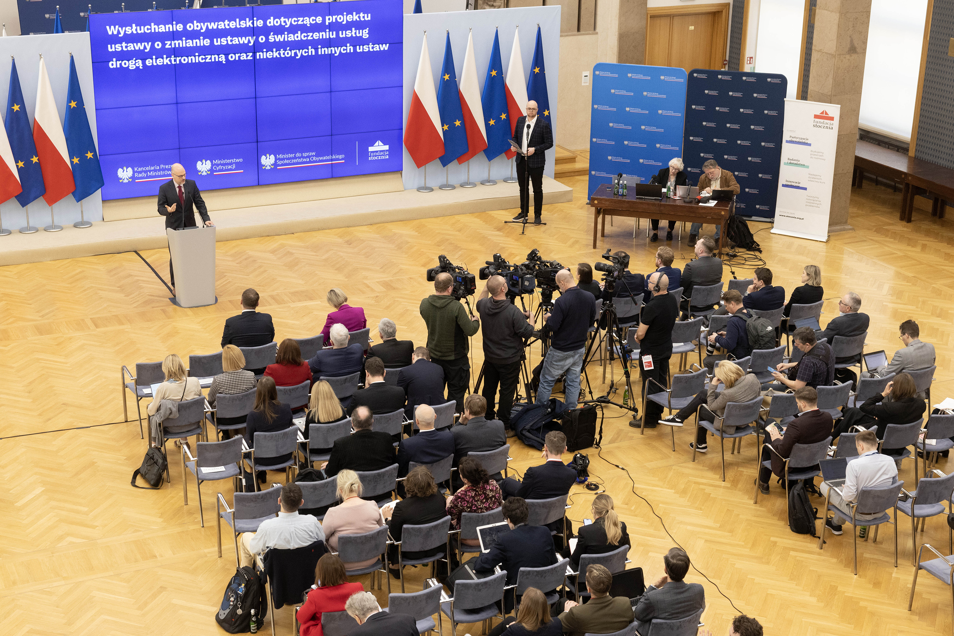 W Kancelarii Prezesa Rady Ministrów odbyło się dziś wysłuchanie obywatelskie dotyczące projektu nowelizacji ustawy o świadczeniu usług drogą elektroniczną. Najważniejszym celem jest ochrona praw użytkowników Internetu przed szkodliwymi treściami i zwiększenie odpowiedzialności platform cyfrowych przy zachowaniu wolności słowa.