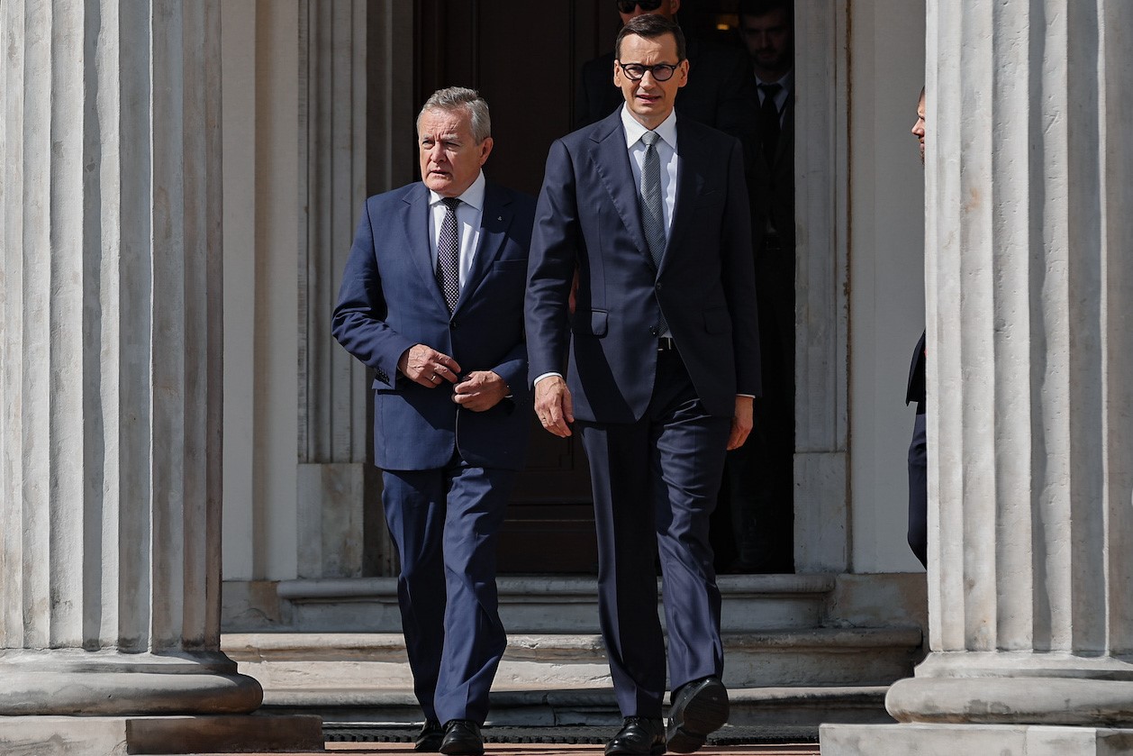 Mateusz Morawiecki i Piotr Gliński podczas konferencji prasowej.