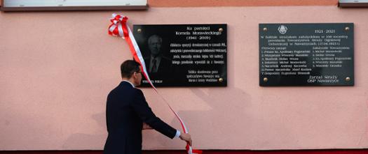 Prime Minister Mateusz Morawiecki attended ceremonies to unveil plaques dedicated to the late Kornel Morawiecki in Jędrzejów and Nawarzyce. He also laid flowers at the plaque commemorating the firefighters, founders of the Voluntary Fire Service in Nawarzyce.
